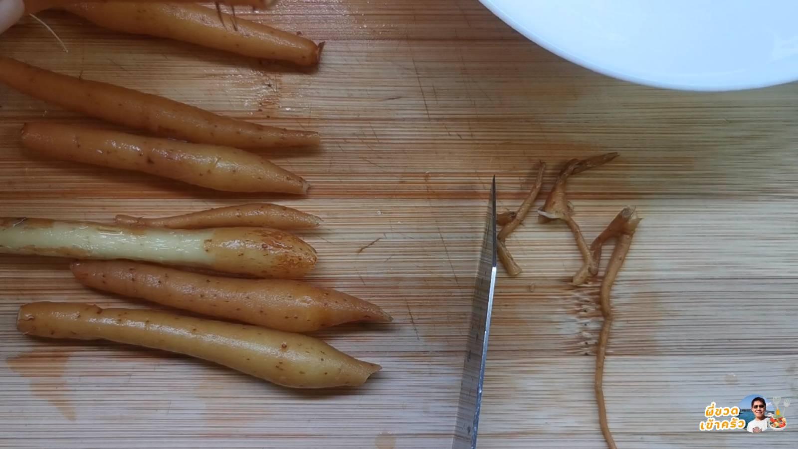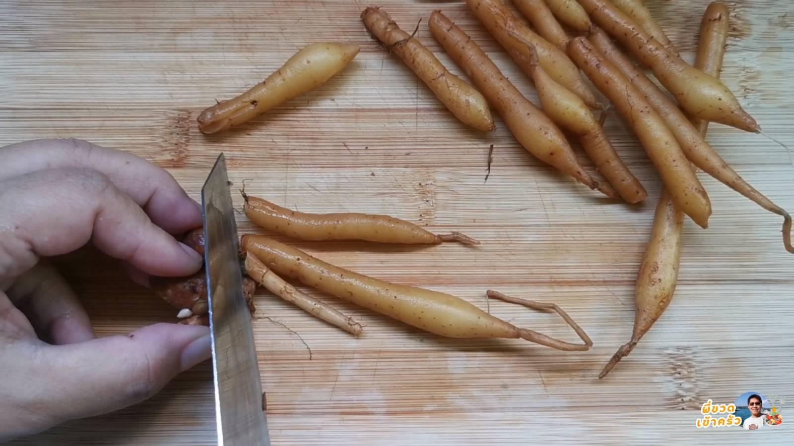 จากนั้นนำขึ้นมาตัดปลายรากออก