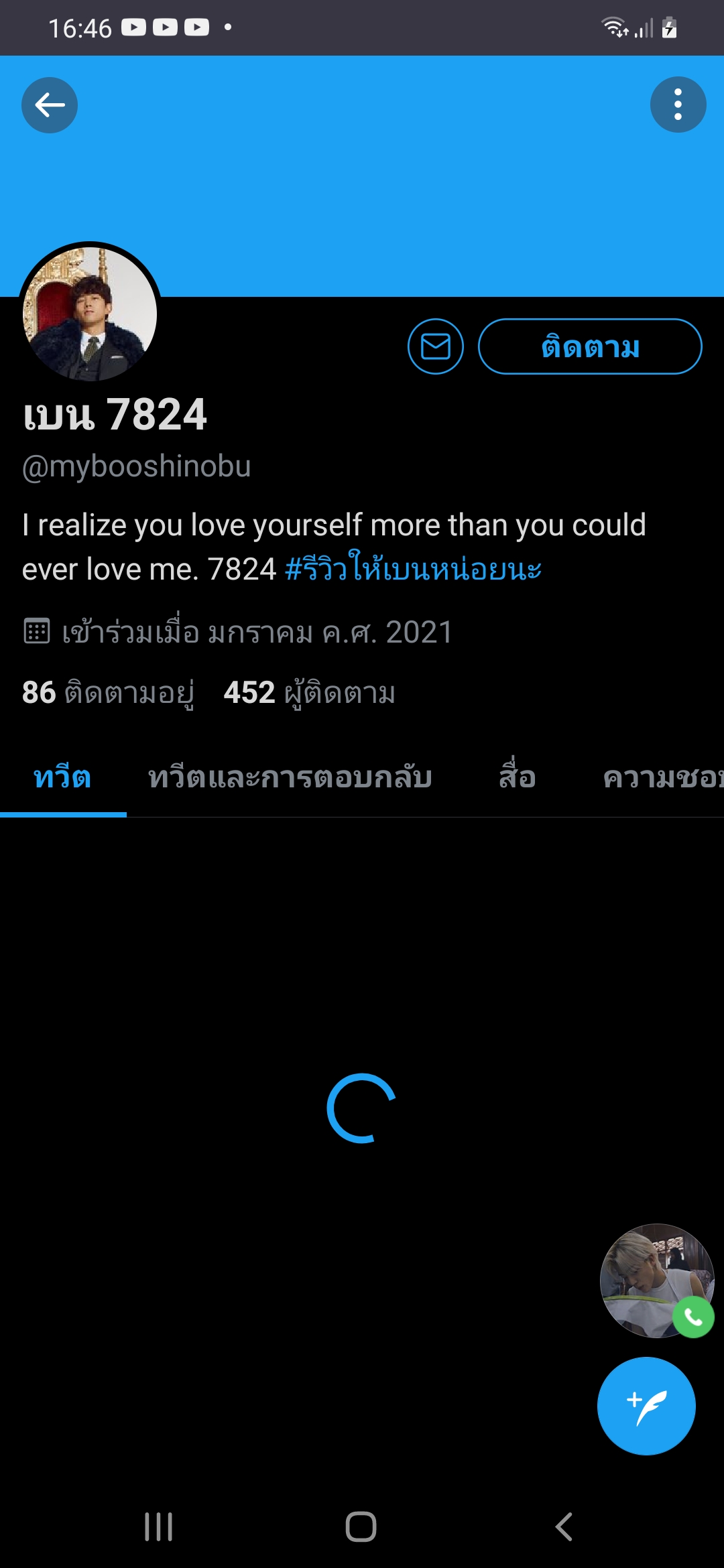 คือว่าเราเพิ่งมาสังเกตอ่ะค่ะ พอเรากดเข้าไปที่หน้าทวิตของคนที่เราฟอลเค้าอยู่แล้วเพื่อที่จะกดรูปซองจดหมายเพื่อdmไปหา แต่มันไม่มีรูปซองจดหมายอ่ะค่ะ!!! มีแต่กดกระดิ่งแจ้งเตือนกับปุ่มสีฟ้าๆที่เขียนว่าfollo