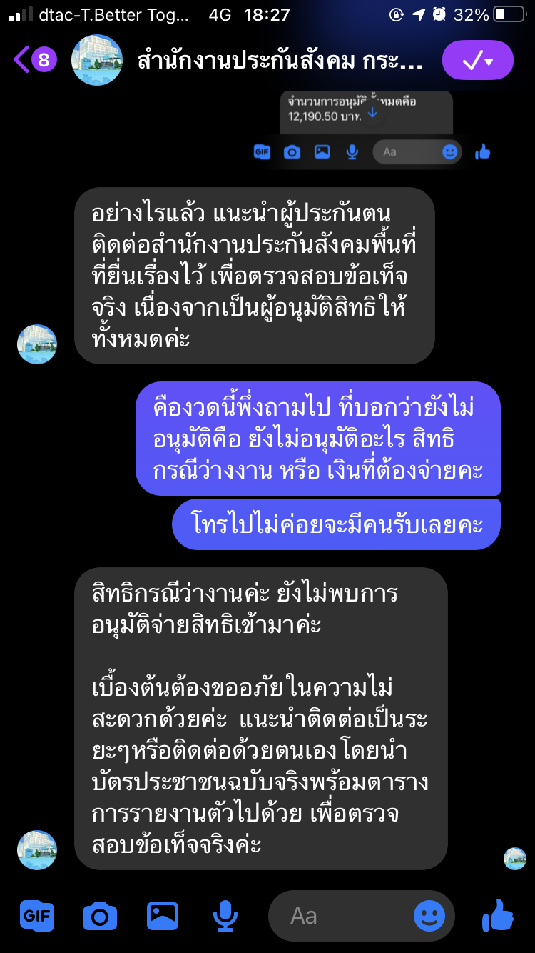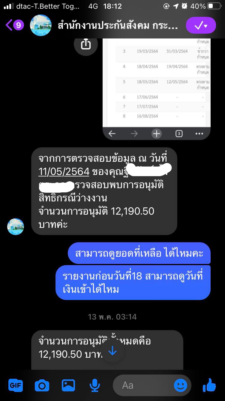 แต่ไม่ได้เงินเราเลยไปสอบถามประกันสังคม เขาตอบมาว่าชื่อเรายังอยู่ในระบบที่ทำงาน หลังจากนั้นประมาน ต้นเดือนเมษาพี่ที่โรงโทรมาบอกว่า เอาชื่อออกจากระบบแล้ว เราเลยลองไปสอบถามประกันสังคมใหม่ เขาระบุว่าพบการอนุมัติกรณีว่างงาน ได้รับขอมูลเรียบร้อยแล้ว วงเงิน 12,190฿ แต่ยังไม่ระบุวันนำจ่าย หลังจากนั้นประมาน 3 วัน ทางประกันสังคมได้โอนเงินเข้ามางวดแรกวันที่ 21เมษายน 64 โดยโอนเข้า 2 ครั้งยอดแรก 3,386 ยอดที่สอง 677 บาท และวันที่ 22 เมษายน 64 โอนเข้ามาอีก 3,386 บาท รวมทั้งหมดที่ได้รับ 7,749.5 และยังไม่ได้รับอีก 4,470 บาท หลังจากนั้นเรารายงานตัวตามกำหนดและสอบถามไปยังประกันสังว่าอนุมัติเงินรึยัง ทางประกันสังคมบอกว่า ไม่พบสิทธิกรณีว่างงานแล้ว คืออะไรคะ ได้รับเงินแค่สองงวด อีกงวดจะไม่ให้หรอคะ อีกอย่างทางแอพ sso เราเข้าไปดูประวัติการใช้สิทธิประโยชน์ทดแทน ข้อมูลที่เราได้รับกลับหายไปหมด เราอยากรู้คืออะไร มีใครทำแล้วได่ ครบตามจำนวนเงินไหมคะ