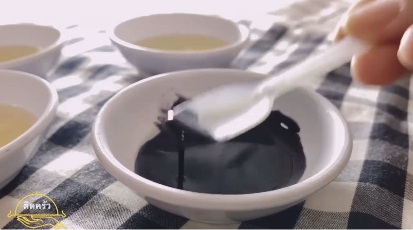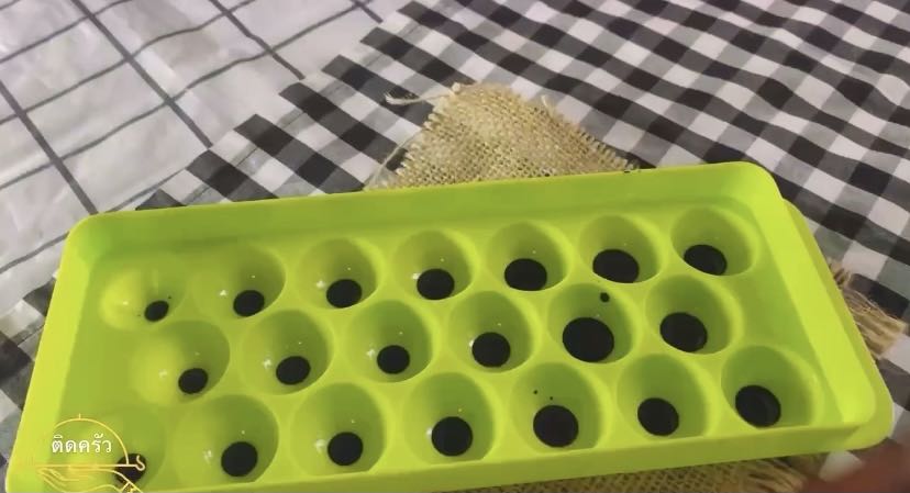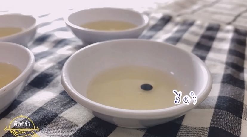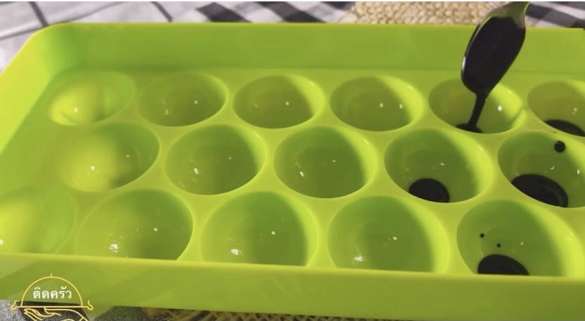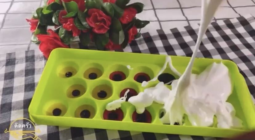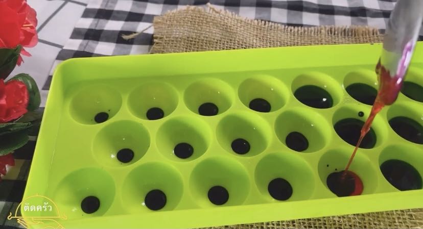 พอผสมสีแล้ว นำสีดำมาหยอดใส่พิมพ์เป็นหยดลักษณะลูกตาดำ แช่เย็น1นาที ให้เซ็ทตัว จากนั้นหยอดสีต่างๆเพิ่ม