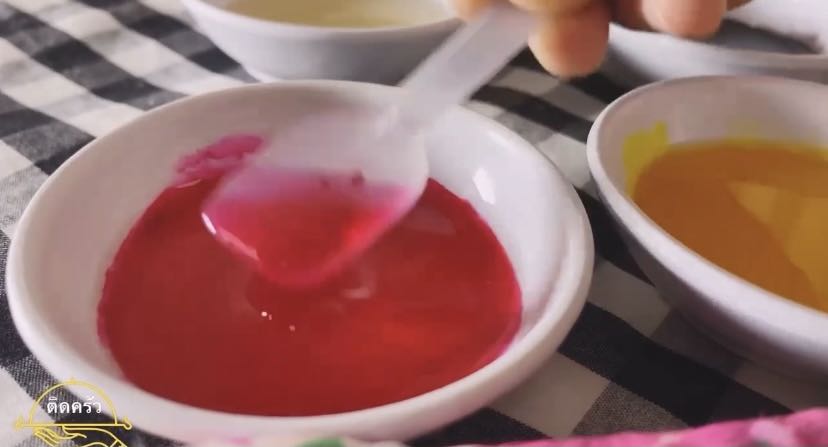 แช่เจลาตินให้อิ่มน้ำ แล้วนำไปตุ๋นให้ละลาย ขั้นตอนนี้ใครอยากให้มีรสชาติเพิ่มน้ำตาลได้นะคะ จากนั้นแบ่งเป็นสี่ส่วน ผสมสีดำ ชมพู เหลือง เขียว