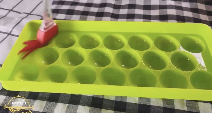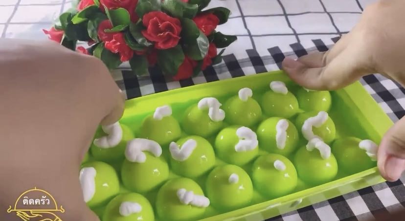 พอเซ็ทตัวแล้ว แกะออกจากพิมพ์ ใช้กรรไกรตัดแต่งให้เป็นทรงกลม หากติดมือใช้แป้งข้าวโพดในการทำแป้งนวล