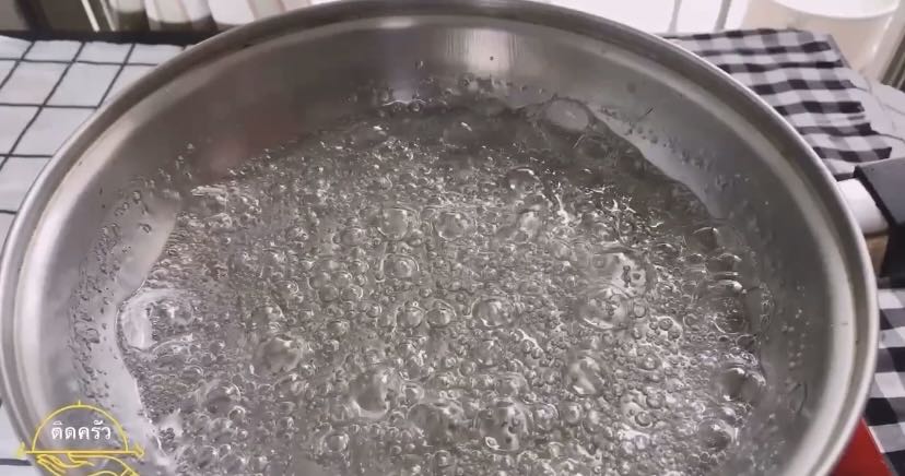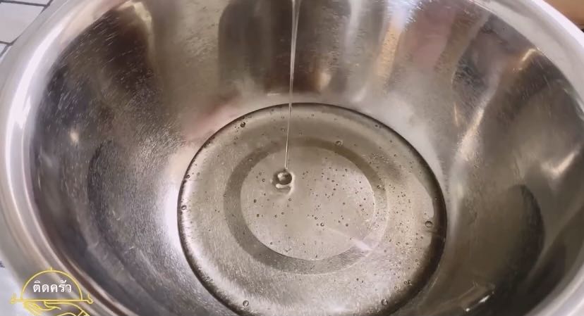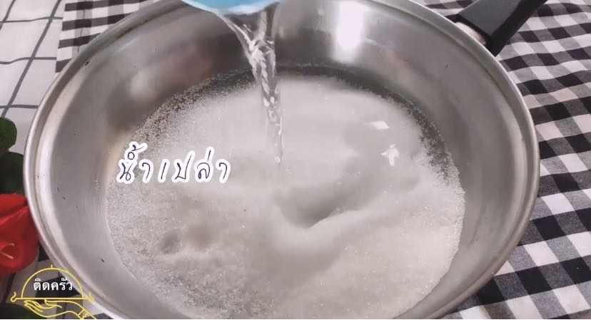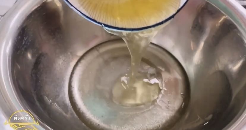 แช่เจลาตินในน้ำสัก15นาที ให้เจลาตินดูดน้ำ จากนั้นเคี่ยวน้ำตาลให้เป็นน้ำเชื่อมเหนียว จากนั้นนำสองส่วนมาผสมกัน
