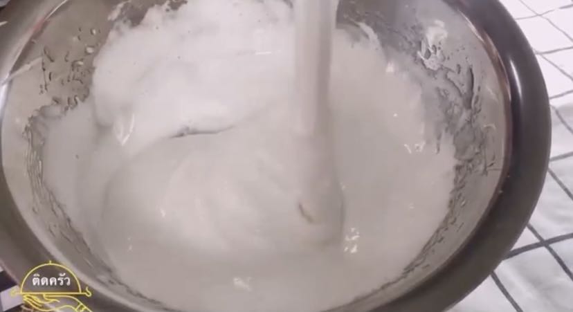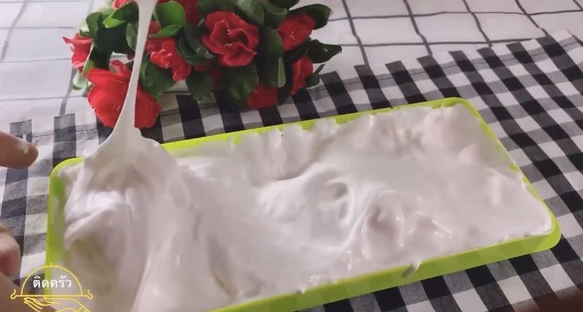 ตีจนขึ้นฟูเป็นเยลลี่มาชเมลโล่ แล้วเทลงพิมพ์ ภักไว้ 15นาที หรือจนเซ็ทตัว