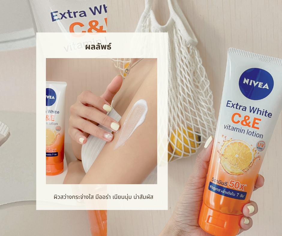 เจ้าตัวนี้มีชื่อว่า “NIVEA C&E Vitamin Lotion” หรือเรียกง่ายๆ ว่าวิตามินโลชั่น เจ้าตัวนี้เข้มข้นไปด้วยวิตามินจากธรรมชาติ มีทั้งวิตามิน C บริสุทธิ์ 95% ช่วยบูสท์ผิวให้ดูกระจ่างใสขึ้นจริง และวิตามิน E เข้มข้น ช่วยให้ผิวชุ่มชื้น ฉ่ำเด้ง ป๊อปปี้บอกเลยว่านางดีกว่ากลูต้าอีก เพราะว่านางมีสารสกัดจากธรรมชาติเข้มข้น ให้ผิวกระจ่างใสแบบดูสุขภาพดี ไม่ขาวซีดหรือเป็นอันตรายต่อผิวแน่นอน
