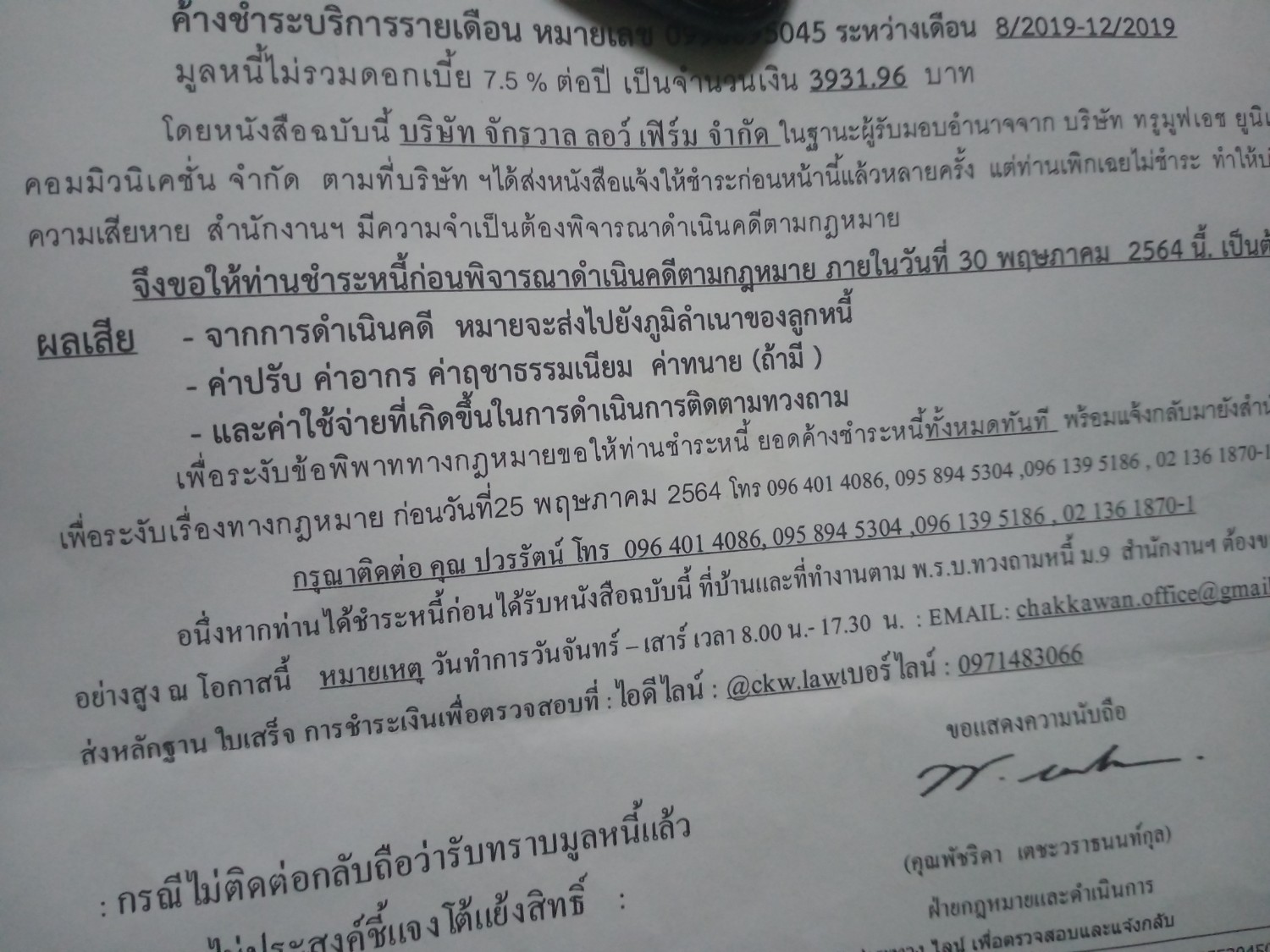 มีจดหมายส่งจากบริษัท จกรวาล ลอว์ เฟิร์ม จำกัด ทวงนี้หนี้ให้ บริษัท ทรูอินเทอร์เน็ต คอร์เปอเรชั่น จำกัด เลขที่สัญญา 281725082 ในจดหมายเขียนเตือนครั้งสุดท้าย ให้ชำระหนี้ภายใน 29/10/2568 แต่ผมพึ่งได้รับ