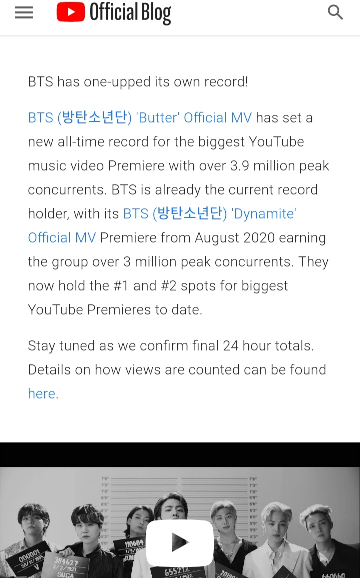 Guniness World Records บันทึกสถิติใหม่ของเพลง 'Butter' ทำลายสถิติโลก ทั้ง Youtube และ Spotify *สถิติได้รับการยืนยันจากทาง Youtube และ Spotify สถิติใหม่โดย 'Butter' ➡ ทำลายสถิติวีดีโอที่มีผู้ชมม