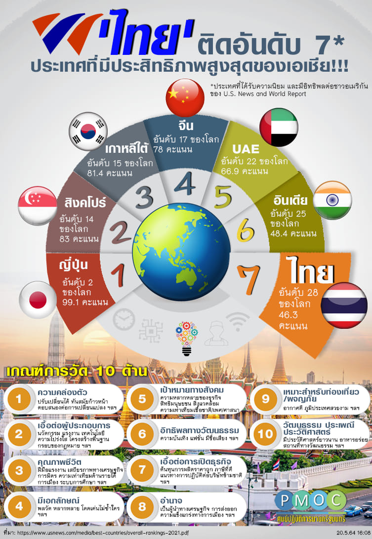 การจัดอันดับประเทศที่มีประสิทธิภาพที่สุดในโลก ปี 2021 (Best Countries 2021) พบ ไทยติดที่ 7 ประเทศมีประสิทธิภาพของเอเชีย และอันดับ 28 ของโลก
