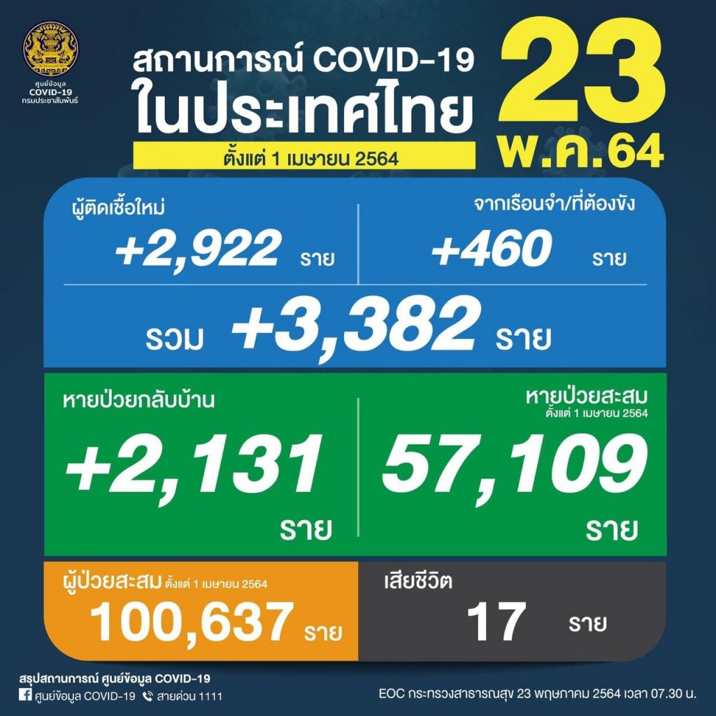 ศูนย์ข้อมูล COVID-19 กรมประชาสัมพันธุ์ เปิดเผย ยอดผู้ติดเชื้อโควิด-19 ประจำวันอาทิตย์ที่ 23 พฤษภาคม 2564 พบผู้ติดเชื้อในรอบ 1 วันที่ผ่านมารวม 3,382 ราย และมีผู้เสียชีวิตเพิ่ม 17 ราย