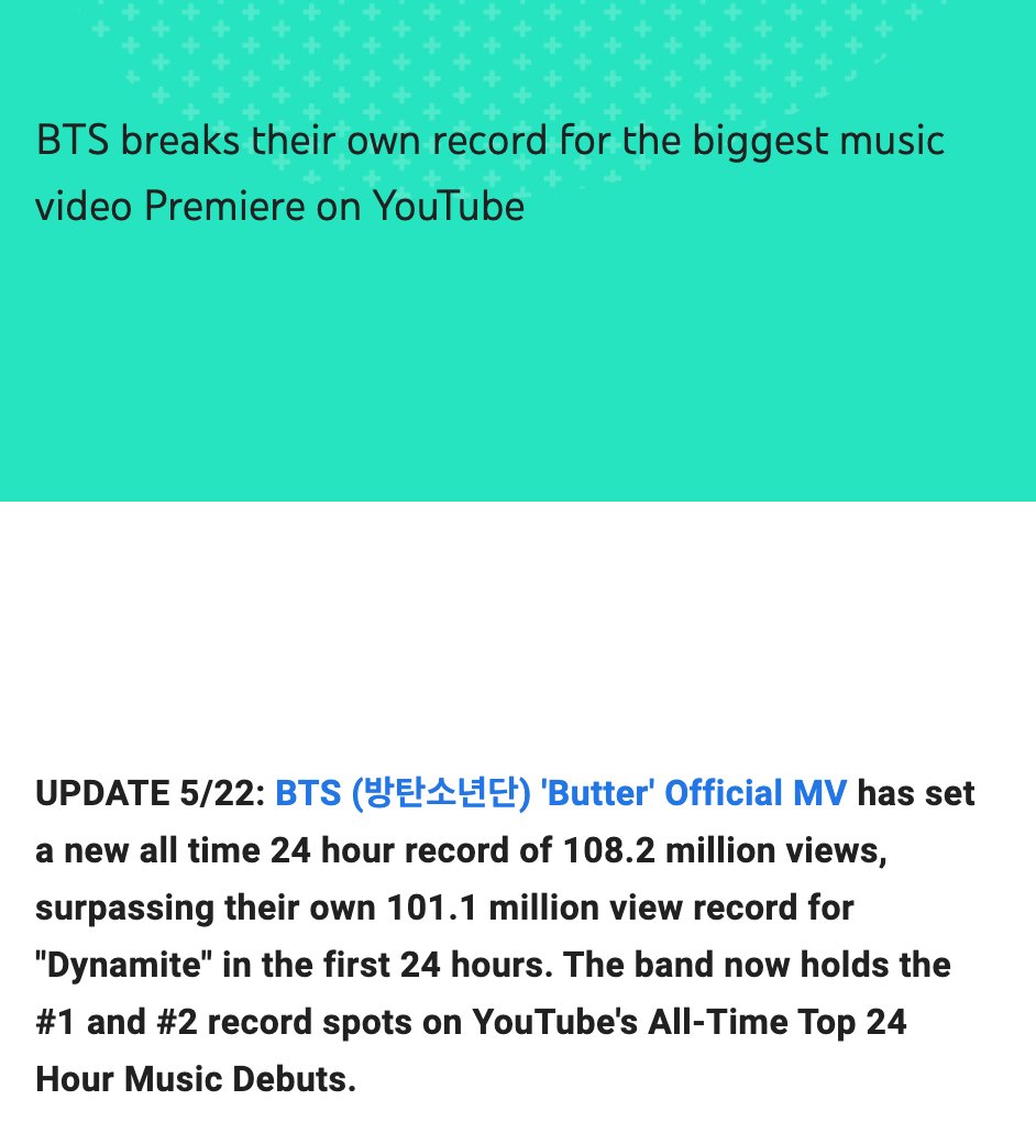 [BTS] Youtube คอนเฟิร์มยอดวิว 'Butter' ทำสถิติสูงสุดตลอดกาลใน 24 ชม.แรกที่ 108.2 ล้านวิว !