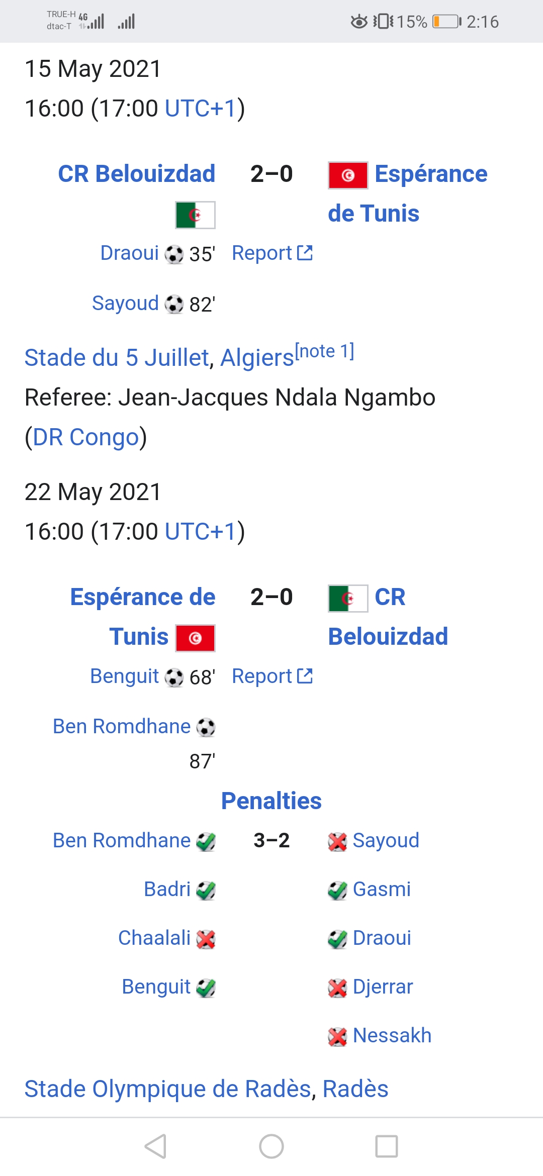 ส่วนผลอีกคู่นึง เอสเพอร์เรนซ์ เด ทูนิส พลิกกลับมาเข้ารอบได้ หลังจากที่นัดแรกแพ้มา2-0 ด้วยการกลับมาชนะ2-0 และดวลจุดโทษชนะไปได้