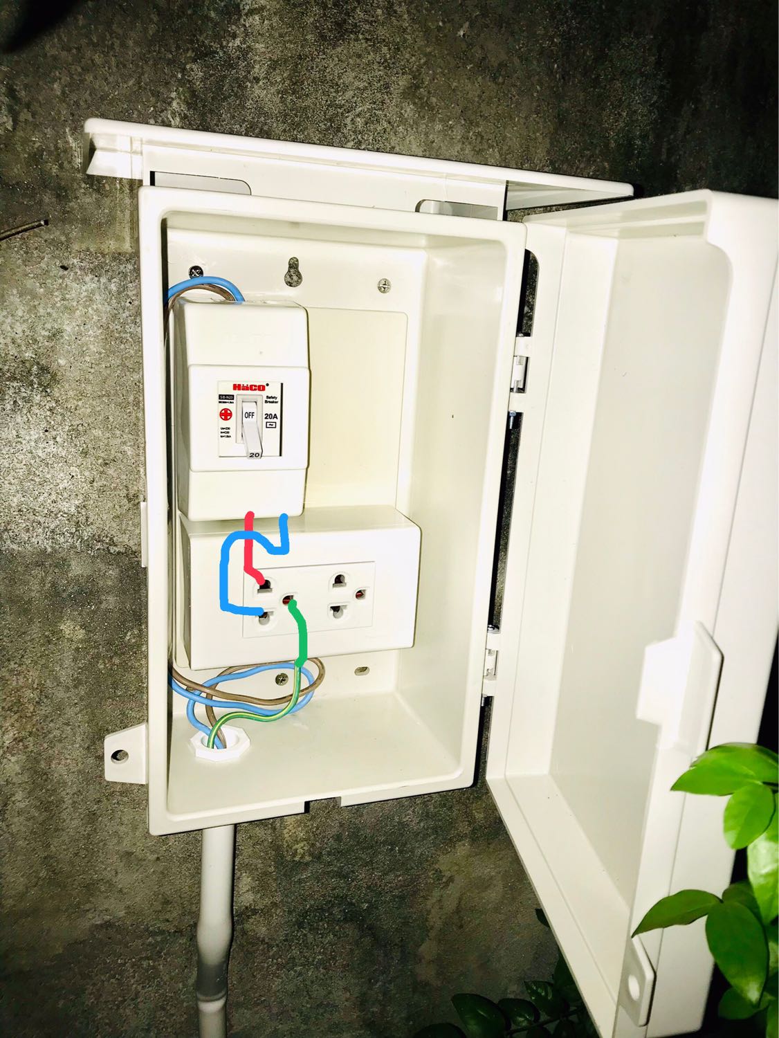 ผมดึงสาย L N G มาจากในบ้านร้อยท่อมาต่อปลั๊กไฟที่กำแพงข้างบ้าน โดยสาย L และ N ต่อผ่านเบรคเกอร์ ส่วนสาย G ต่อเข้าตรงที่ปลั๊กไปจั๊มกับสาย G ของตู้ไฟที่มาจากตัวบ้าน