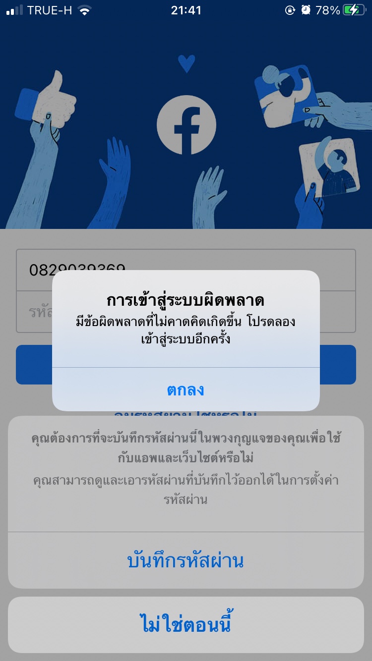 เข้าเฟสไม่ได้ครับเข้าเเล้วขึ้นว่าา การเข้าสู่ระบบผิดพลาด มีข้อผิดพลาดที่ไม่คาดคิดเกิดขึ้นโปรดลองเข้าสู้ระบบอีกครั้ง