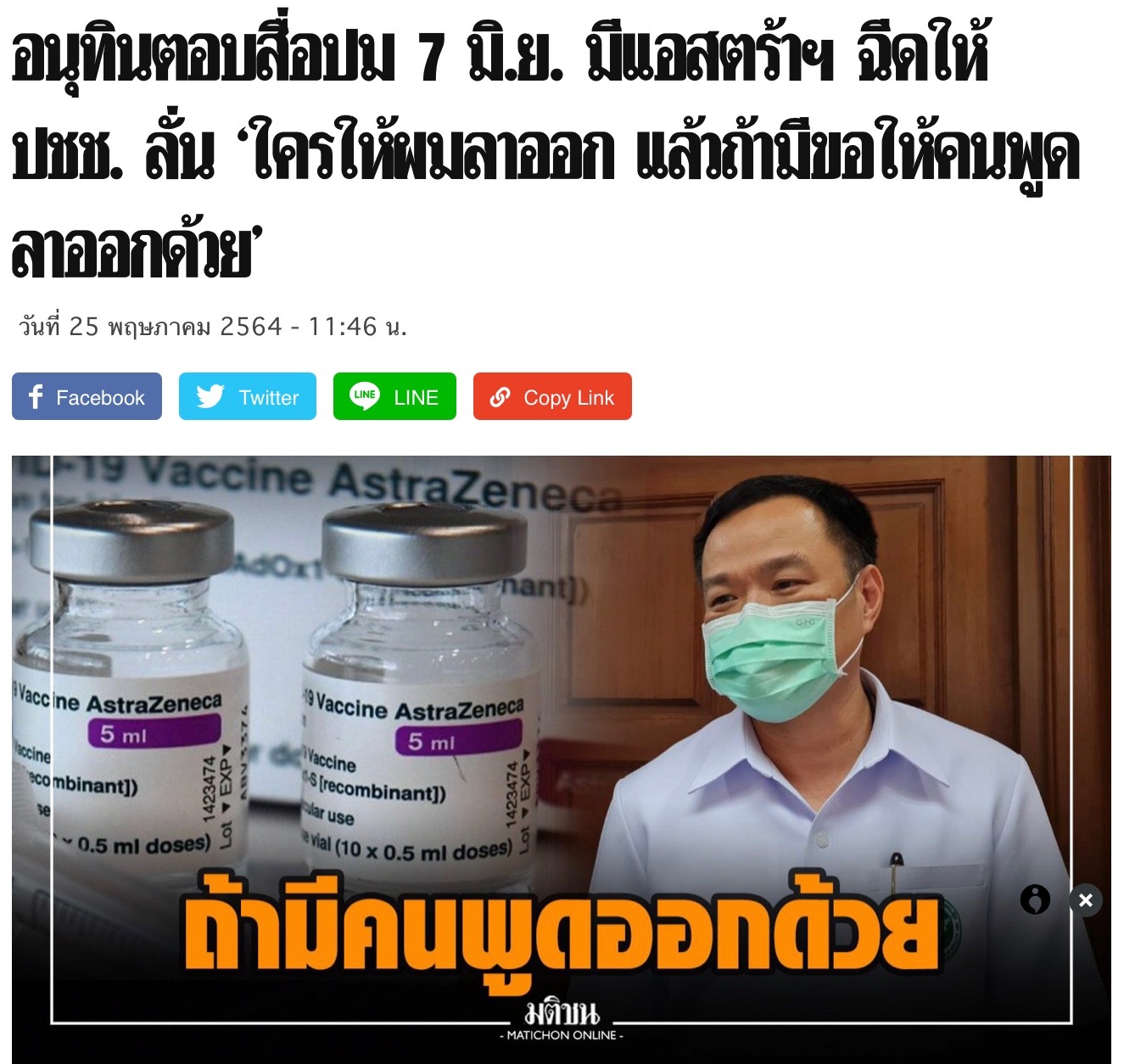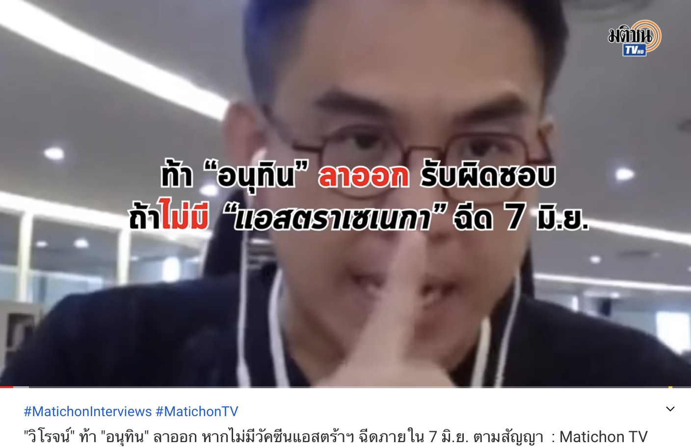 'อนุทิน'รับมอบวัคซีนแอสตร้าเซนเนก้า ล็อตแรกที่ผลิตในไทย (ชมคลิป) วันศุกร์ ที่ 4 มิถุนายน พ.ศ. 2564, 10.39 น. เมื่อวันที่ 4 มิถุนายน 2564 ที่ห้องประชุมช