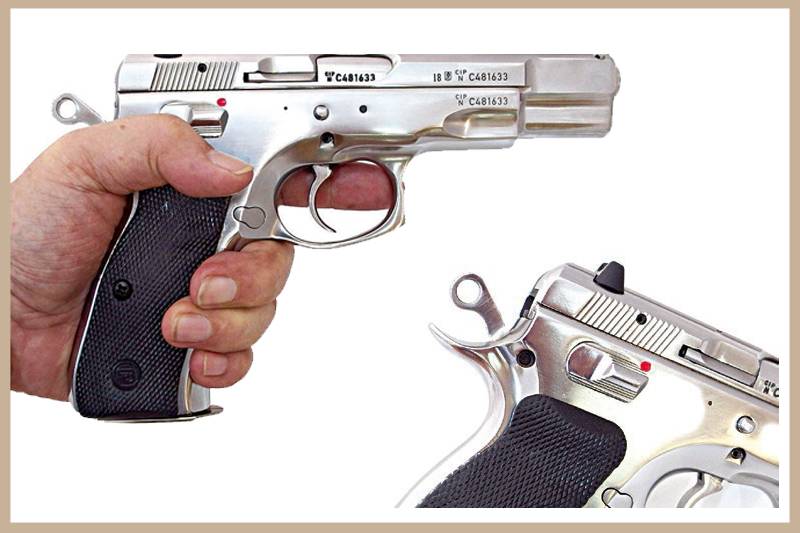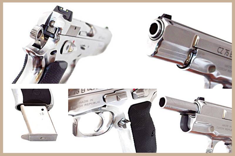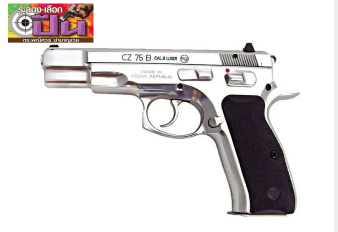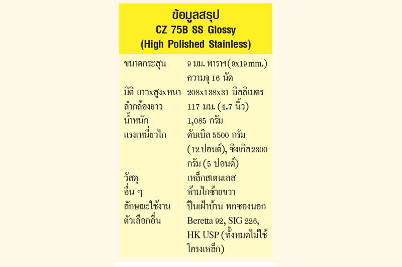 ปืนนายแบบสัปดาห์นี้ ข้างกล่องบรรจุระบุว่า CZ 75B SS Glossy แต่ในแคตตาล็อกบนเว็บ CZ-USA ใช้คำว่า High Polished Stainless ความหมายตรงกันคือวัสดุเหล็กปลอดสนิม ขัดเงาเต็มที่เหมือนผิวกระจก ในด้านการทำงานยังเหมือน 75B ดั้งเดิม คือเป็นระบบรีคอยล์ ขัดกลอนด้วยลำกล้องกระดก สันขัดกลอนซ่อนในลำเลื่อนหน้าช่องคัดปลอก ตัวลำกล้องยาว 4.7 นิ้ว ควบคุมการกระดกด้วยห่วงลูกเบี้ยว โครงปืนหุ้มรางจับลำเลื่อน ไกดับเบิล/ซิงเกิล มีคันห้ามไกบนโครงปืนทั้งซ้ายขวา สามารถเข้าห้ามไกเมื่อนกง้างสุดได้โดยนกไม่ตก เพื่อการพกพาแบบ “cocked-and-locked” สำหรับผู้ที่ต้องการยิงนัดแรกแบบซิงเกิล ซองกระสุนปรับเพิ่มจำนวนบรรจุจาก 15 ดั้งเดิม เป็น 16 นัด และเจาะช่องล็อกไว้ทั้งซ้ายขวา ให้กลับตัวล็อกไปไว้ด้านขวาได้ถ้าต้องการ ด้ามเป็นยางแข็งสีดำ ส่วนกลางนูนหนุนอุ้งมือ สามารถเปลี่ยนเป็นด้ามอะลูมิเนียมบางพิเศษได้