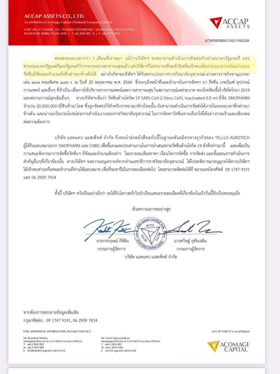 เพียงแต่ก่อนหน้า 1เดือนที่ผ่านมานี้บริษัทไม่สามารถติดต่อเพื่อขอเข้าพบ นายกรัฐมนตรีและรองนายกรัฐมนตรีและรัฐมนตรีว่าการกระทรวงสาธารณสุขเพื่อนำส่งเอกสารและนำเสนอวัคซีนได้เลย