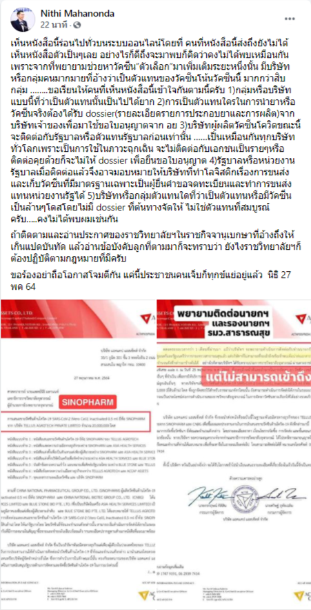 อาจารย์นิธิจากราชวิทยาลัยจุฬาภรณ์โพสเฟสบุ๊คบอกว่ายังไม่เคยเห็นเอกสารตัวจริงเกี่ยวกันการเสนอขายวัคซีนซิโนฟาร์มโดยอ้างว่าส่งเอกสารมาหาท่านที่แชร์กันในโลกออนไลน์เลย