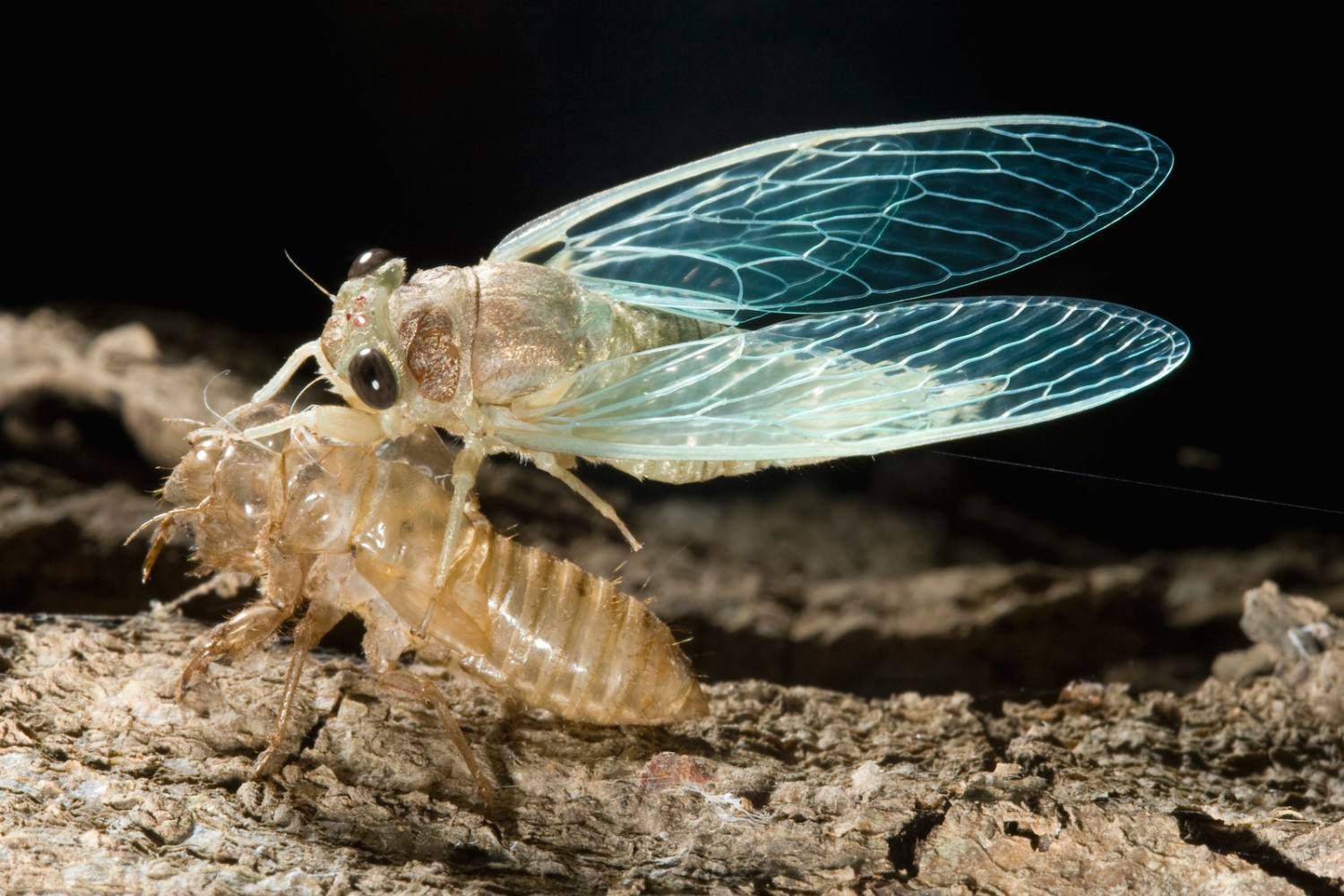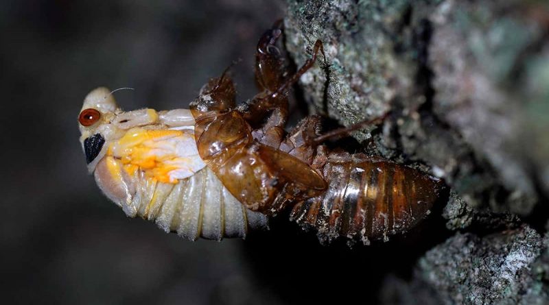 จักจั่นโผล่ขึ้นมาจากพื้นดินและลอกคราบเป็นตัวเต็มวัย