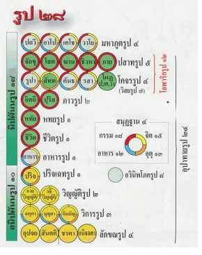 - วัณณรูป คันธรูป รสรูป โอชารูป ( 8 รูปนี้เรียกว่า อวินิพโภครูป เป็นกลุ่มรูปที่เล็กที่สุดที่แยกออกจากกันไม่ได้ สำเร็จจาก สมุฏฐานทั้ง 4)