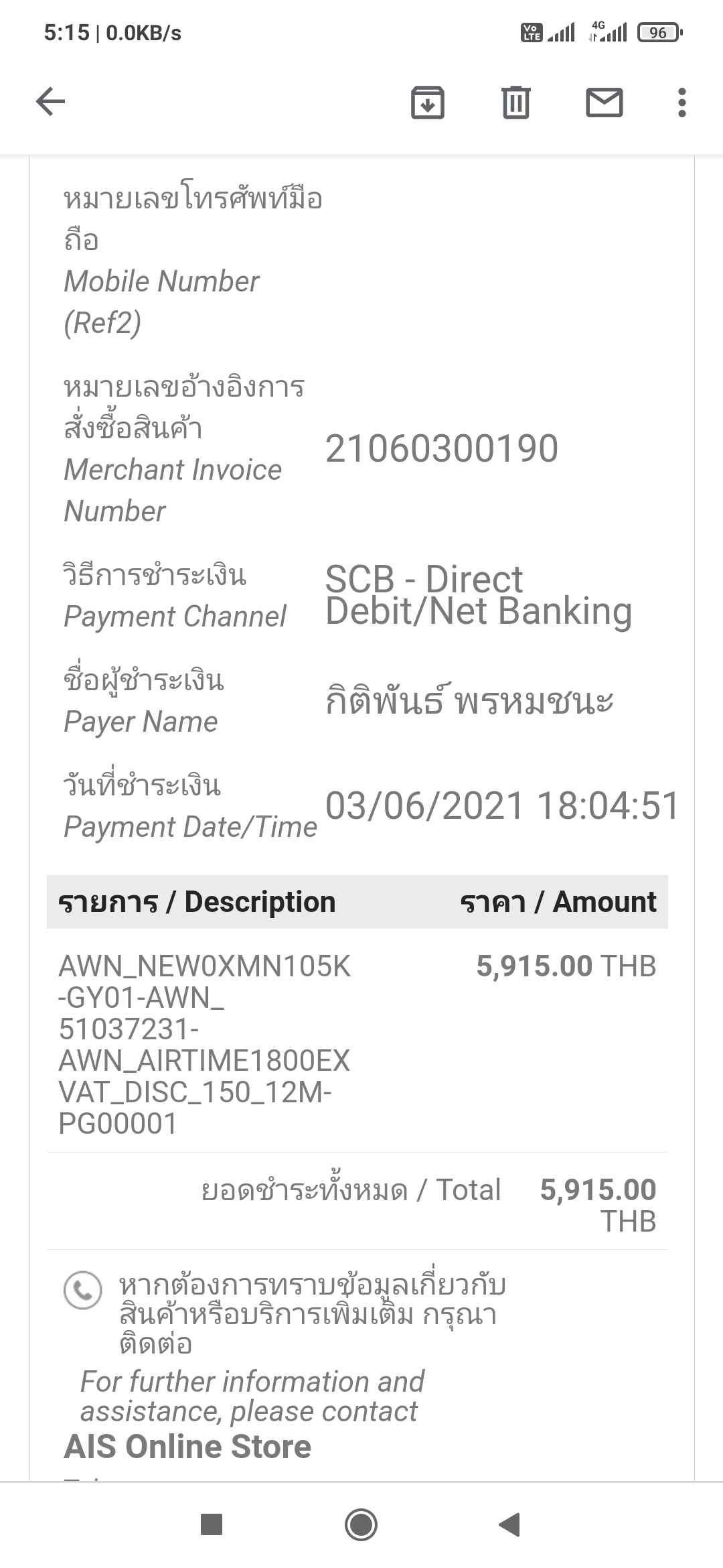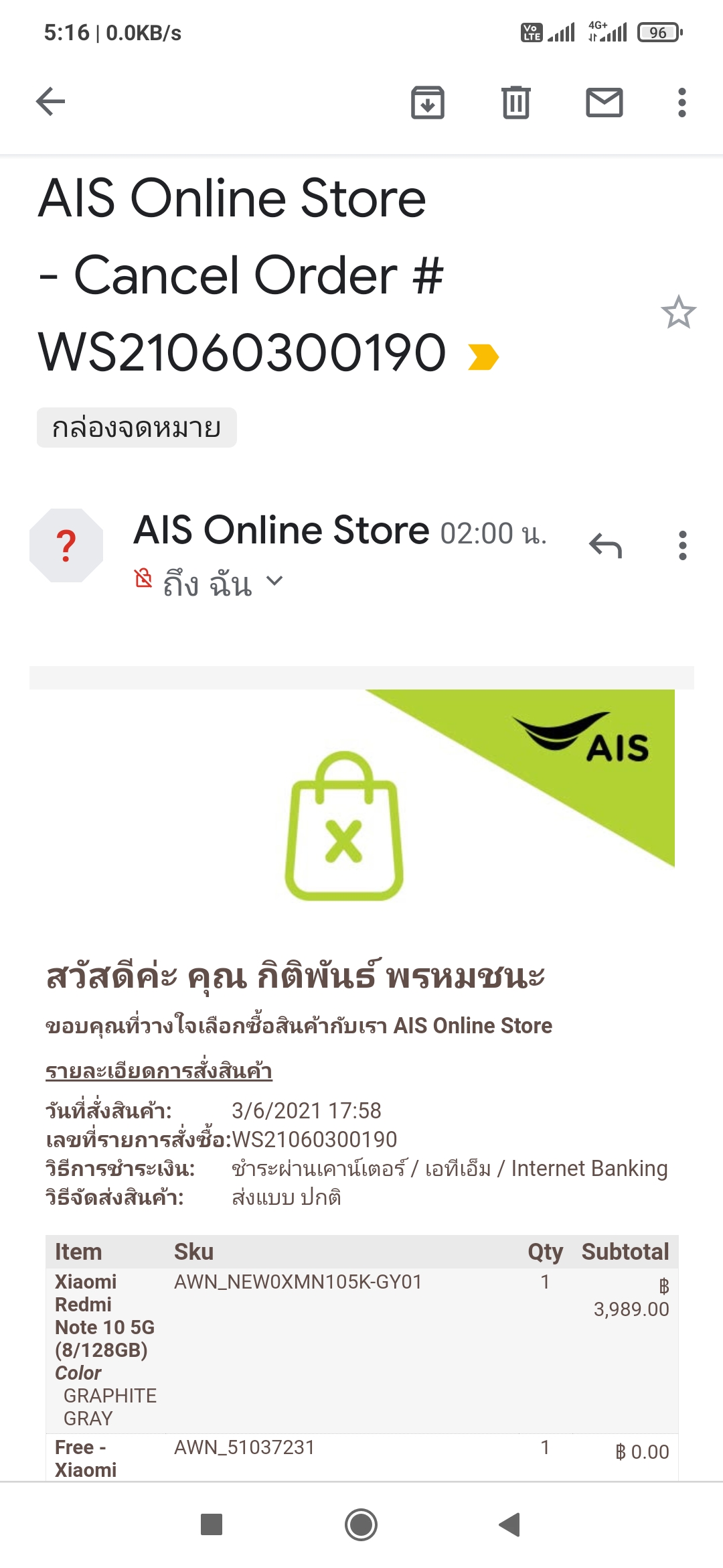 สั่งซื้อสินค้าจาก ais shop แล้วถูกยกเลิก ทั้งที่จ่ายเงินไปแล้ว จะได้เงินค่าหรือมั่ย