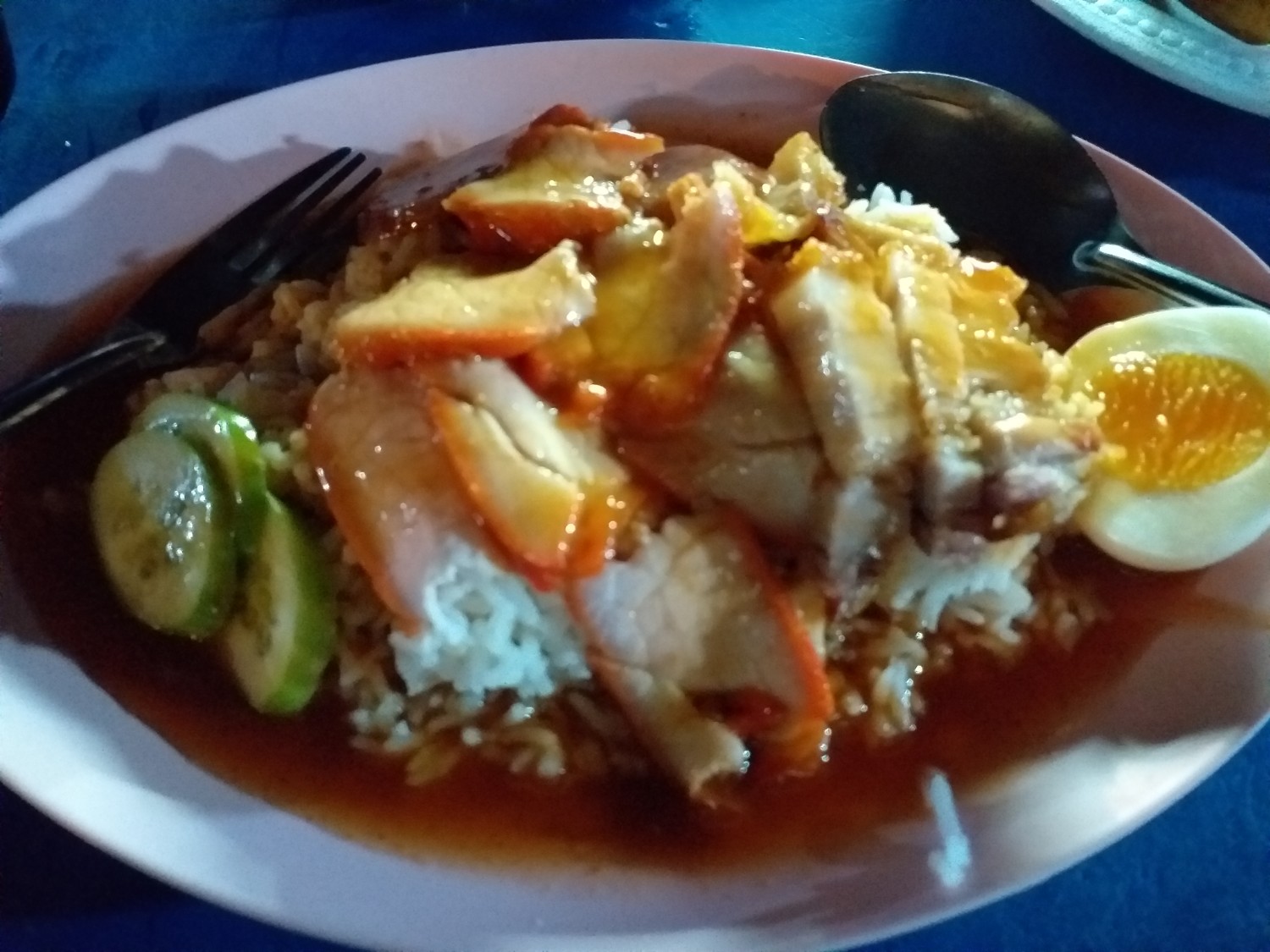 ข้าวหน้า หมูแดง ไก่ต้ม หมูกรอบ 3 อย่าง อิ่มมาก 55 บาท