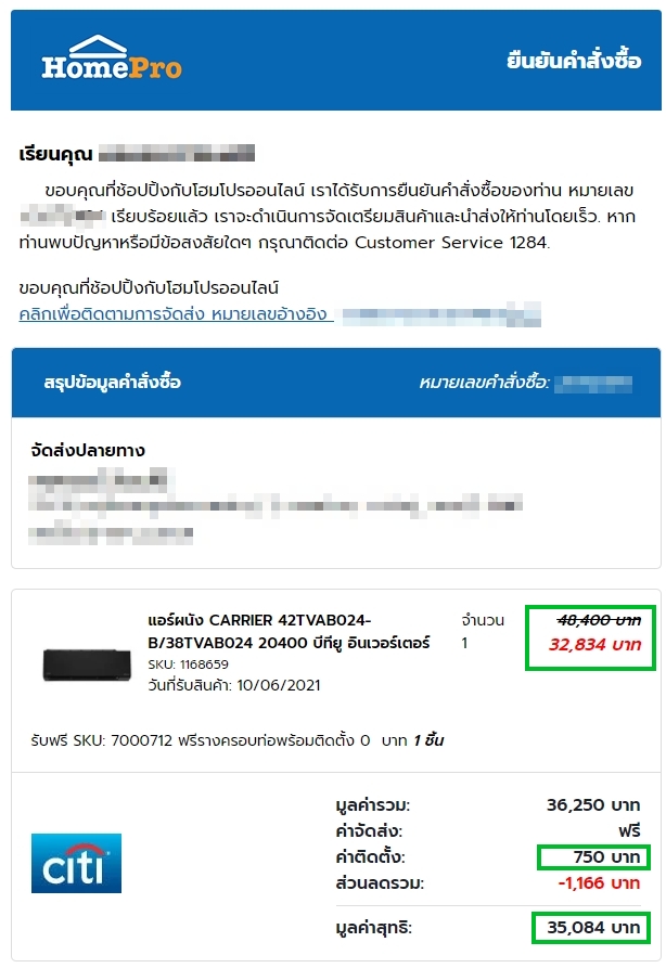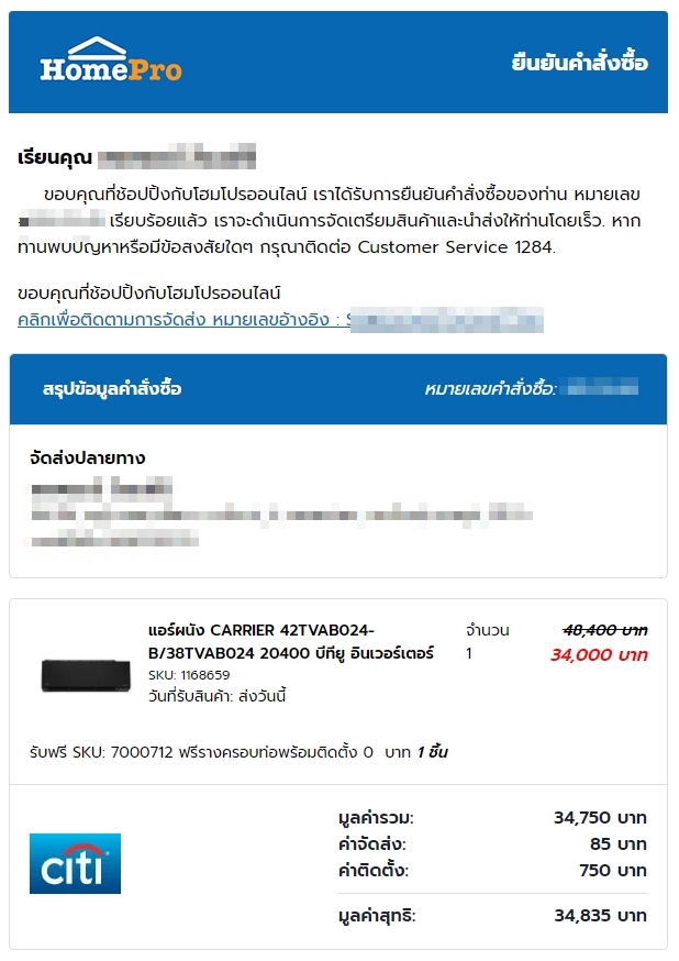 แอร์ที่บ้านมีปัญหา เลยสั่งซื้อกับโฮมโปร กะว่าจะซื้อโปร 6.6 พอดีได้ส่วนลดดีๆ โอเค สั่งซื้อสินค้าเสร็จสรรพ