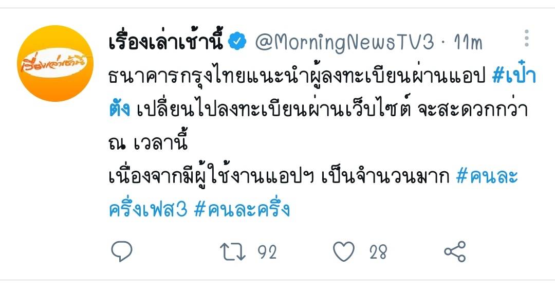 เมื่อเช้ารีบตื่นมาลงทะเบียนคนละครึ่งเฟส3 ให้พ่อั้งแต่6โมง ในใจได้แต่ภาวนาว่าจะไม่มีปัญหาเรื่องรหัส OTP แต่แล้ว เหมือนเดจาวู คำภาวนาไม่เป็นผล รอรหัสจนครบ 10นาที บร๊ะเจ้า!!!!!! กดรีเฟรชอีกที อ้าว.... ส