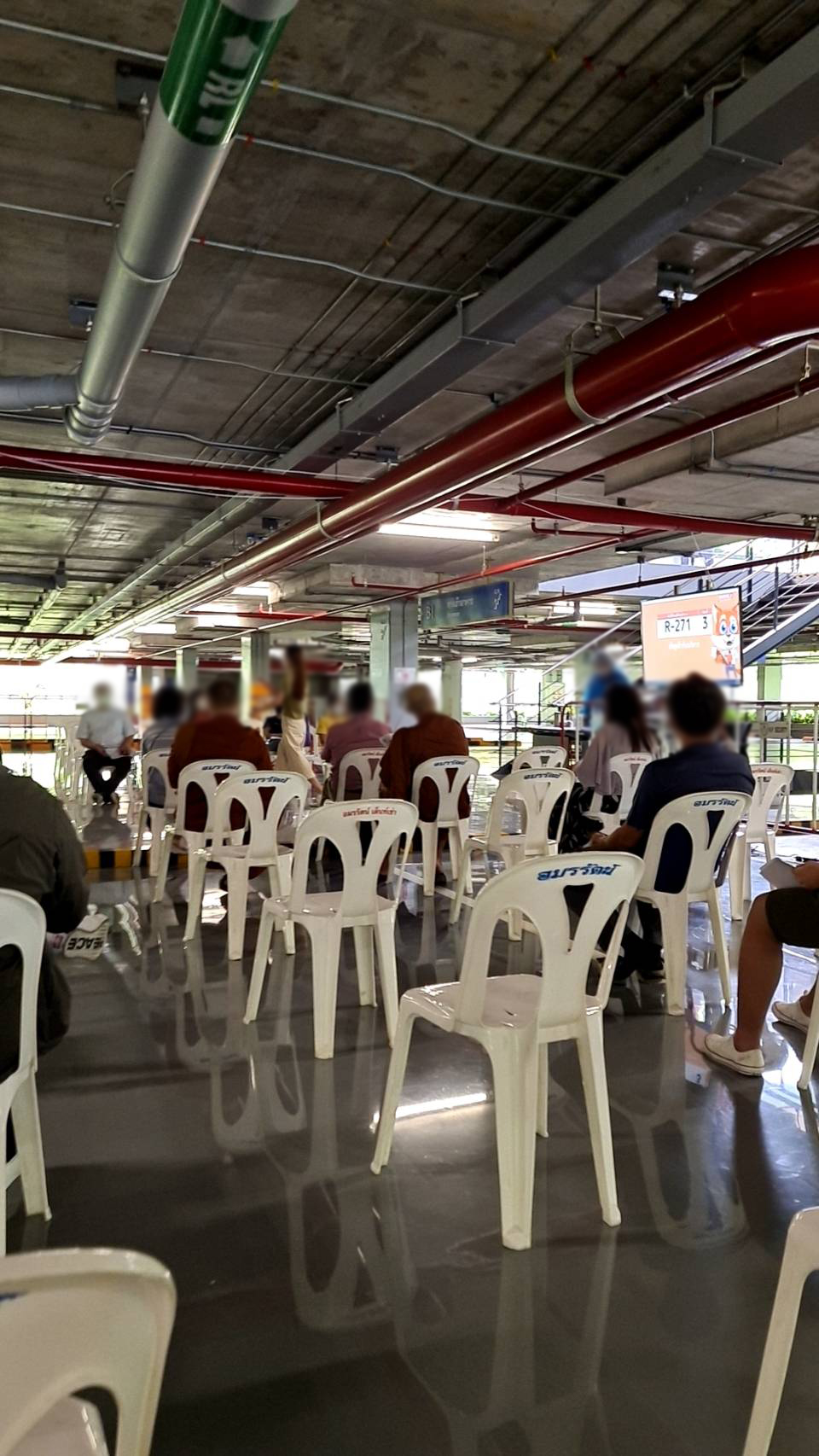 2. เมื่อถึงคิว (ส่วนมากจะเรียกทีละ 10 คิว ถ้าจำผิดขออภัยครับ) ให้ขึ้นมาข้างบน ซึ่งจะมีเก้าอี้ให้นั่งรอ และรักษาระยะห่างไว้ + มีผู้ให้คำแนะนำ ทั้งข้างบนข้างล่าง ตลอดเวลาครับ รวมถึงในห้องพักดูอาการ ก็มีผู้ให้คำแนะนำ และ บุคลากรทางการแพทย์ครับ
