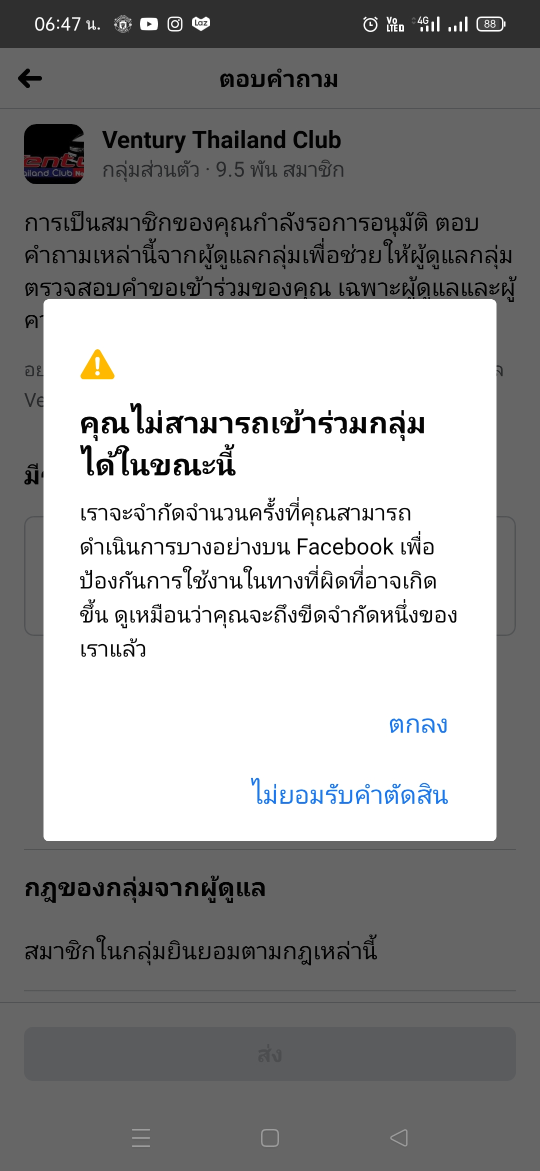 หวัดดีครับ ขอคำเเนะนำหน่อยครับ กดเข้าร่วมกลุ่มเฟสบุ๊คมันขึ้นเหมือนในรูป มันบล็อคเข้ากลุ่มใช่ไมครับเเล้ว มีวิธีเเก้ยังไงบ้างครับ ขอบคุณครับ