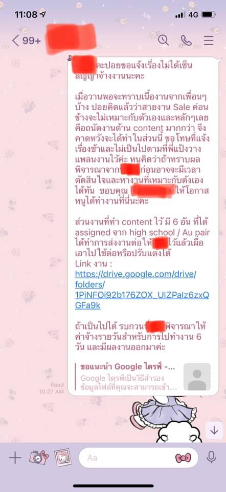 เราตัดสินใจแจ้งเรื่องขอไม่เซ็นสัญญา(เพราะตั้งแต่มาทำก็ยังไม่ได้เซ็นสัญญาแล้ว) พร้อมแจ้งเหตุผลของเรากับเจ้าของที่เป็นภรรยาทางไลน์ เพราะคิดว่าการหายไปเฉยๆ ดูไม่ profreshional เอาสะเลย... แต่สิ่งที่เขาตอบกลับมาคืออนุมานได้เลยว่าการศึกษาอันสูงส่งและเงินในบัญชีหลักล้านไม่ได้พัฒนาจิตใจเลยค่ะ (ตามรูป)
