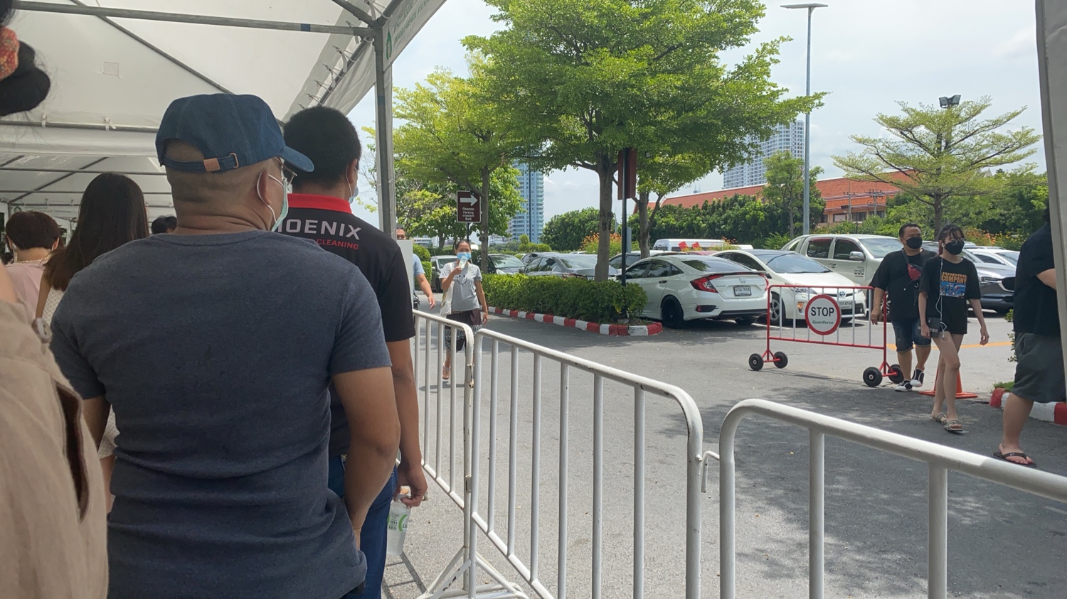 ในจุดนี้ญาติ/ผู้ติดตามคนที่จะฉีด ต้องไปหาที่รอแยกนะคะ เดี๋ยวเราแปะรูปบริเวณที่ต่อแถวให้ดูค่ะ