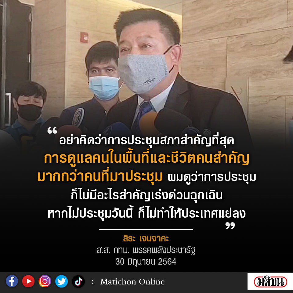 ท่านส.ส. สิระ เจนจาคะ กล่าว "อย่าคิดว่าการประชุมสภาสำคัญสุด การดูแลคนในพื้นที่และชีวิตคนสำคัญกว่าคนมาประชุม"