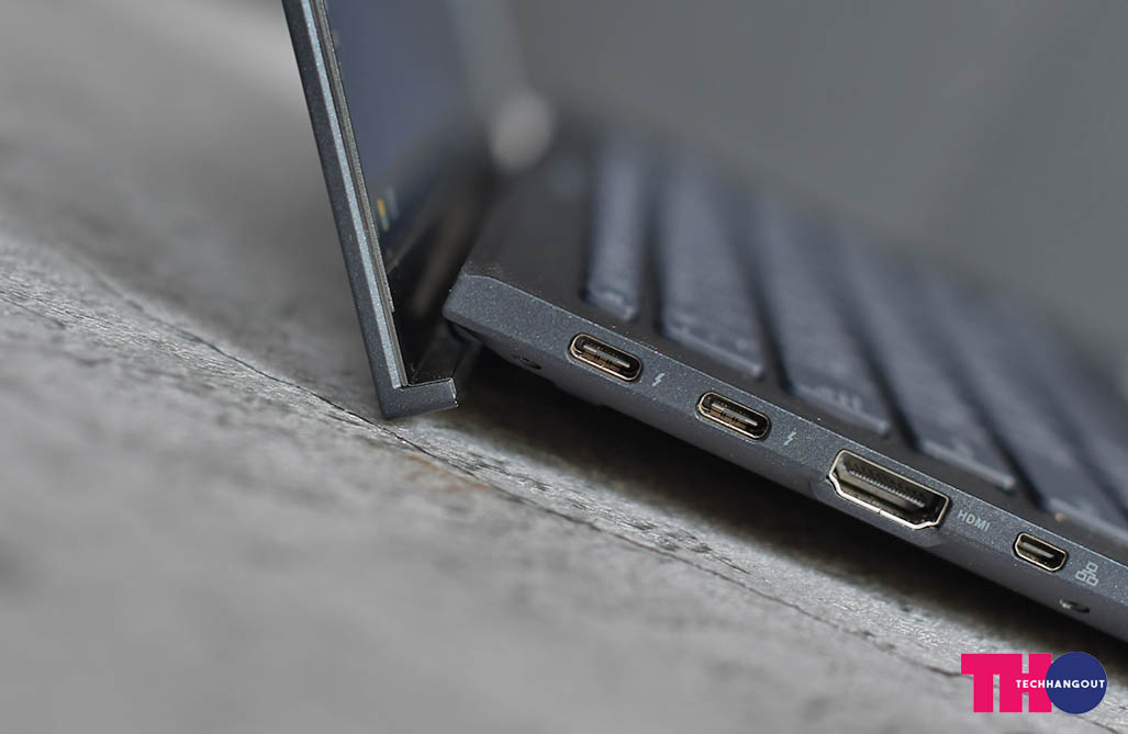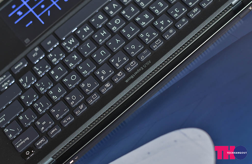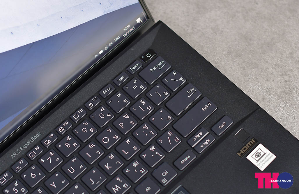 ช่องระบายอากาศนั้นเราจะเห็นว่าขอบส่วนบนนั้นจะเป็นช่องระบายอากาศทั้งหมด รวมถึงยิงออกมาตรงขอบหน้าจอเหมือนรุ่นอื่นๆที่เราเห็นทั้งหมดในบรรดา Ultrabook ของค่ายนี้และการยกตัวเครื่อง Ergo Lift เองนั้นก็ถือว่าช่วยในเรื่องของการระบายหรือดูดอากาศได้ดีกว่าแบบเรียบๆเป็นจุดเด่นของ Asus Ergo Lift เลยก็ว่าได้ ส่วนวัสดุข้างในเป็นเหมือนกับทั้งเครื่องทั้งหมด แบบด้านแต่ไม่ติดรอยนิ้วมือครับ รวมถึงมีตำแหน่งการวางอะไรทำได้ดีเช่นกัน และสแกนนิ้วมาให้ในมุมขวาล่าง และปุ่มเปิดปิดเครื่องนั้นจะเป็นวัสดุที่แตกต่างกับรุ่นอื่นๆและมีสีดำทำให้เด่นแตกต่างขึ้น