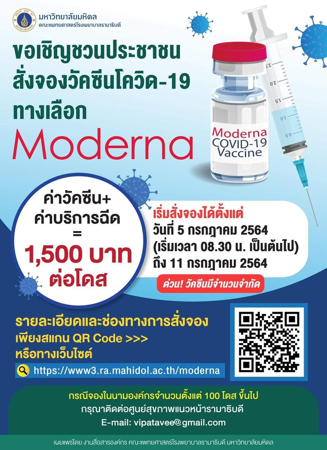 สำหรับการจองในกลุ่มองค์กรจำนวน 100 โดส ขึ้นไป ให้ติดต่อศูนย์สุขภาพแนวหน้ารามาธิบดี