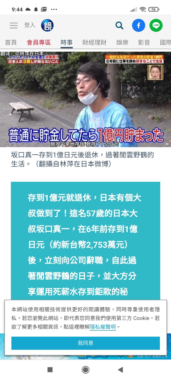 รายการทีวีญี่ปุ่นรายการหนึ่งสัมภาษณ์คุณลุงชาวญี่ปุ่นคนหนึ่งที่กำลังนั่งเล่นที่สวนสาธารณะ เขาเล่าว่าปัจจุบันอายุ 57 ปี เขาเล่าว่าสิ่งที่เขาทำเป็นประจำก็คือการมานั่งเล่นที่สวนสาธารณะดูผู้คนที่มาทำกิจกรรมต่างๆที่นี่ เขาเกษียณตัวเองจากการทำงาน6 ปีแล้ว เคยมีรายได้จากการทำงานเป็นพนักงานออฟฟิศรายได้ปีละ 4.5 ล้านเยน หรือประมาณ 1.3 ล้านบาท วันที่เกษียณเพราะวันนั้นมีเงินเก็บจากการทำงานครบ 100 ล้านเยน หรือประมาณ 29 ล้านบาท มีบ้านของตัวเองราคาประมาณ 12 ล้านบาทผ่อนหมดเมื่อ 14 ปีที่แล้ว เขาวางแผนว่าจะไม่ใช้เงินเก็บนี้เพื่อตัวเองวันหนึ่งที่จะจากไปก็จะนำเงินนี้ไปบริจาค