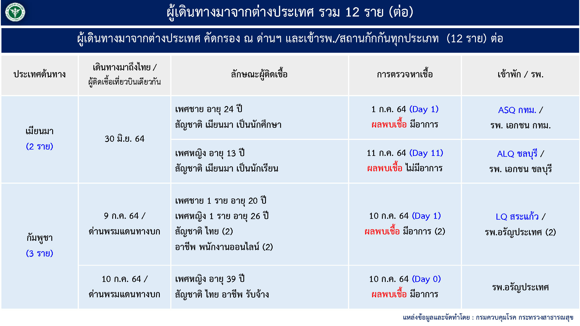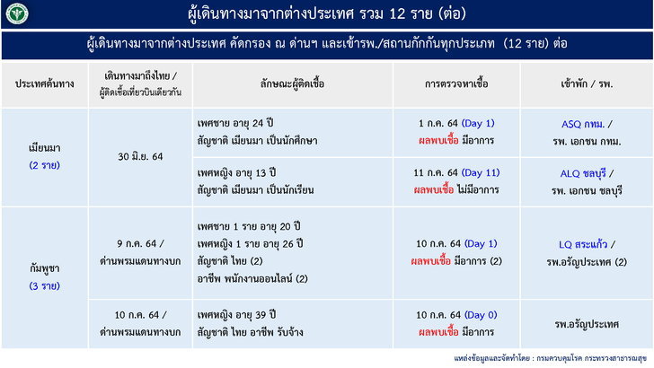 สำหรับผู้ติดเชื้อรายใหม่ที่เป็นผู้ที่เดินทางมาจากต่างประเทศ เพิ่มขึ้นในวันนี้ 12 ราย และเข้า Quarantine โดยเข้ารับการรักษาที่กรุงเทพฯ(3) ชลบุรี(1) สระแก้ว(3) ตาก และ อยู่ระหว่างประสาน(5) มีรายละเอียดดังนี้