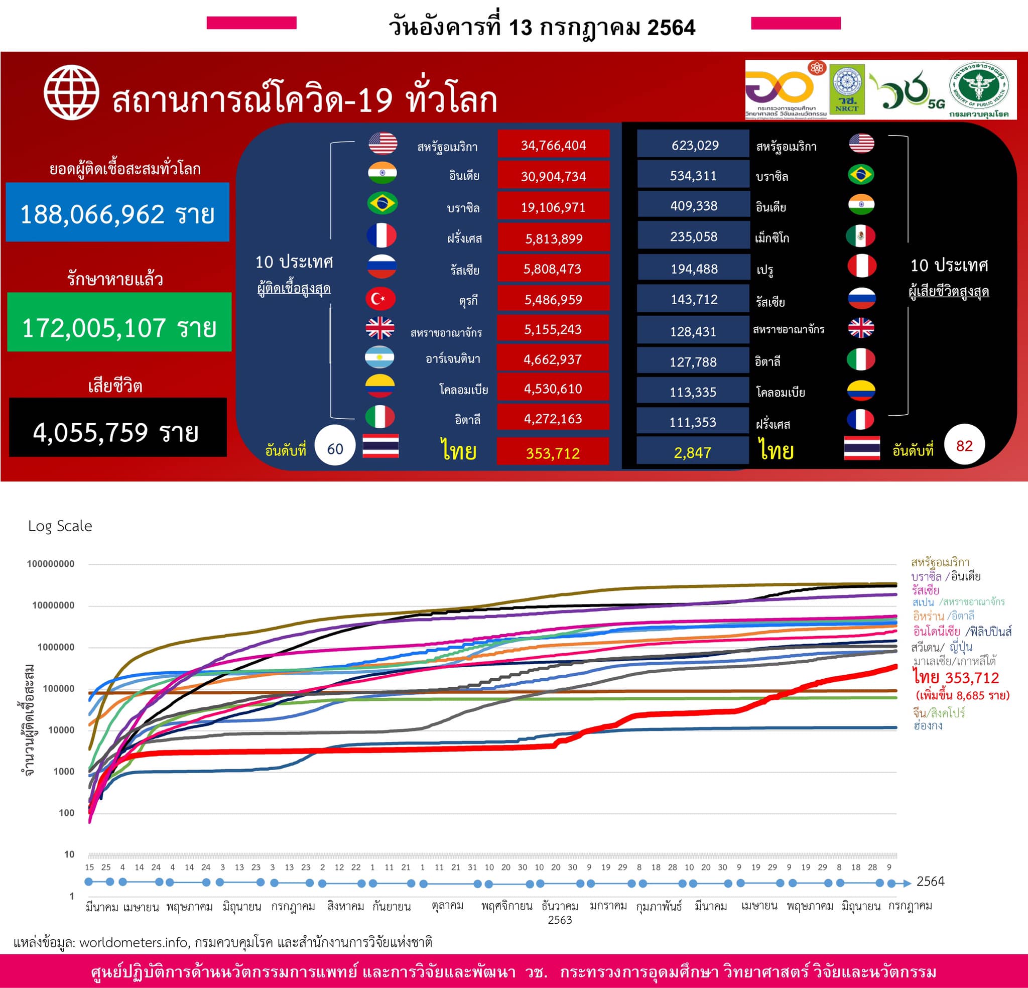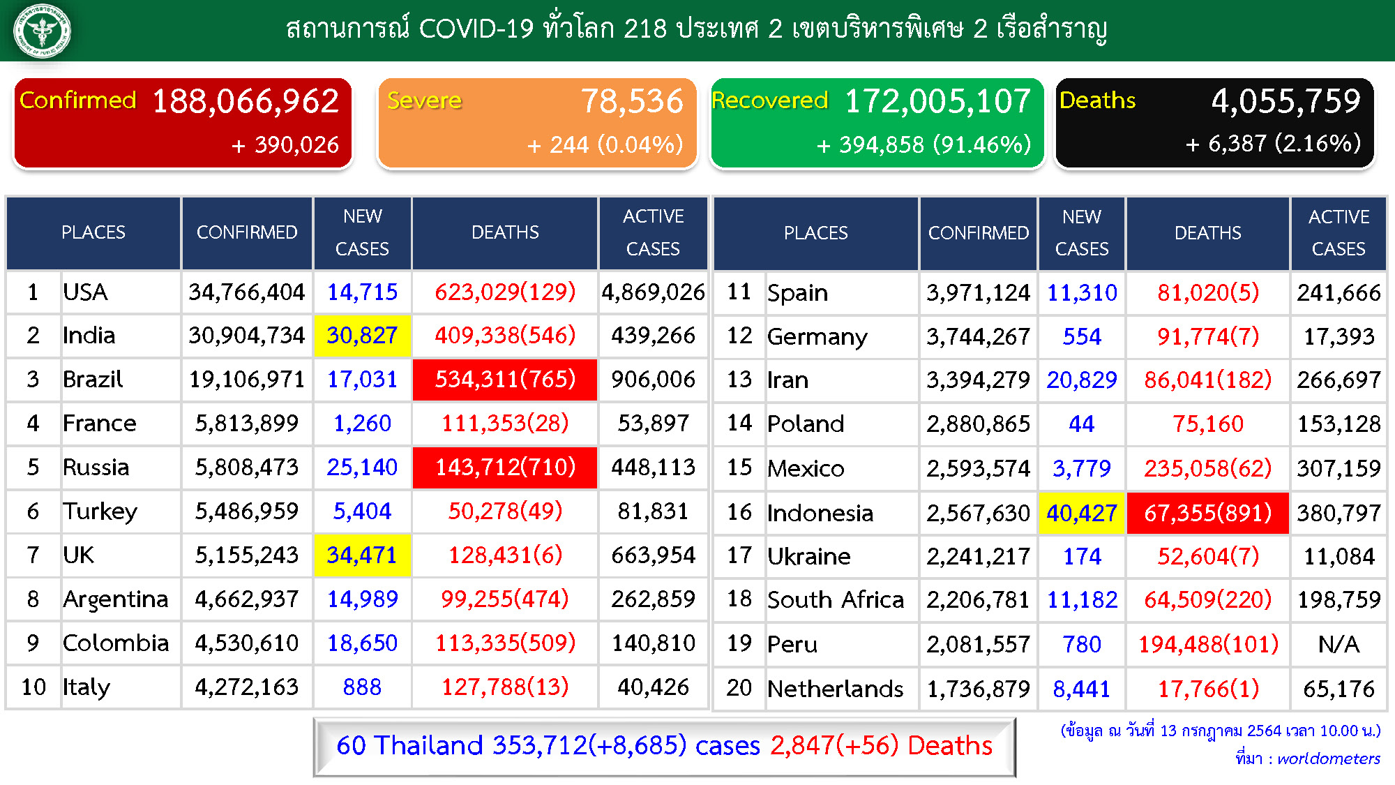 - ยอดผู้ติดเชื้อสะสมทั่วโลก 188 ล้านราย มีจำนวนผู้เสียชีวิตสะสมกว่า 4 ล้านราย(คิดเป็นร้อยละ 2.16 ของจำนวนผู้ติดเชื้อ) ในขณะที่ผู้รักษาหายมีจำนวน 172 ล้านราย (คิดเป็นร้อยละ 91.46)