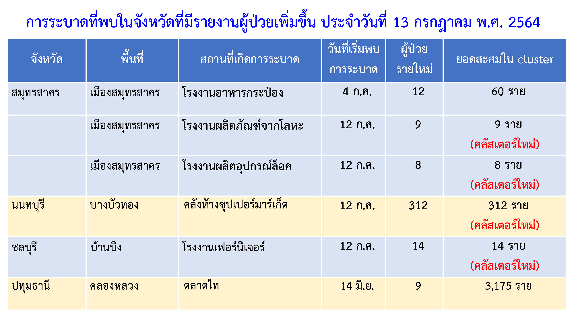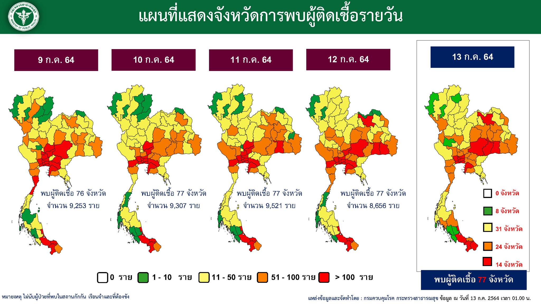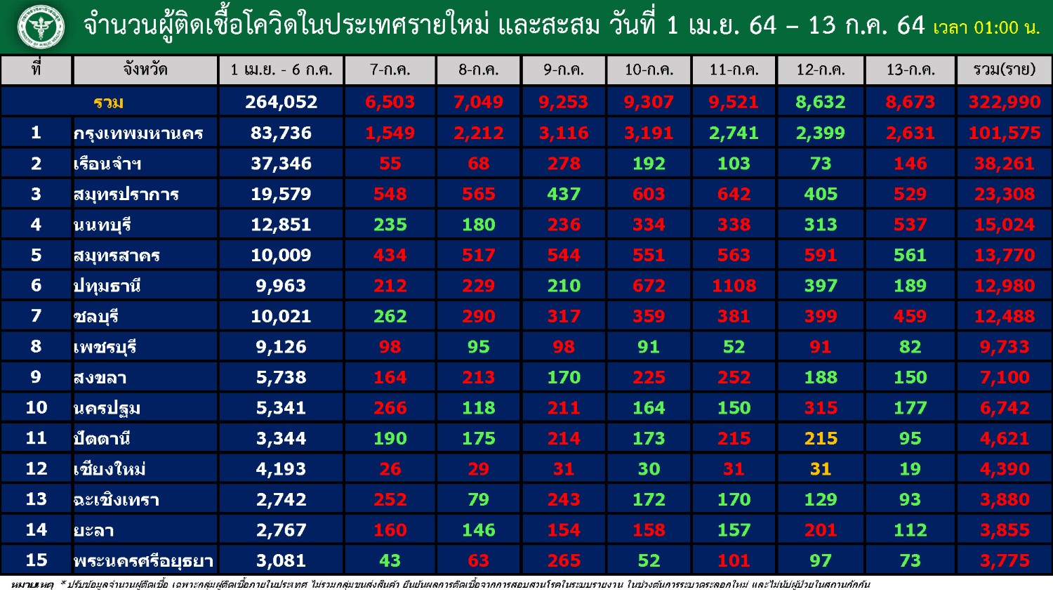 ผู้ติดเชื้อรายใหม่ภายในประเทศ (ไม่รวมเรือนจำ) 8,527 ราย มีรายละเอียดดังนี้ จากกรุงเทพฯ(2,631) ปริมณฑล (1,993) จังหวัดอื่น ๆ (3,903)
