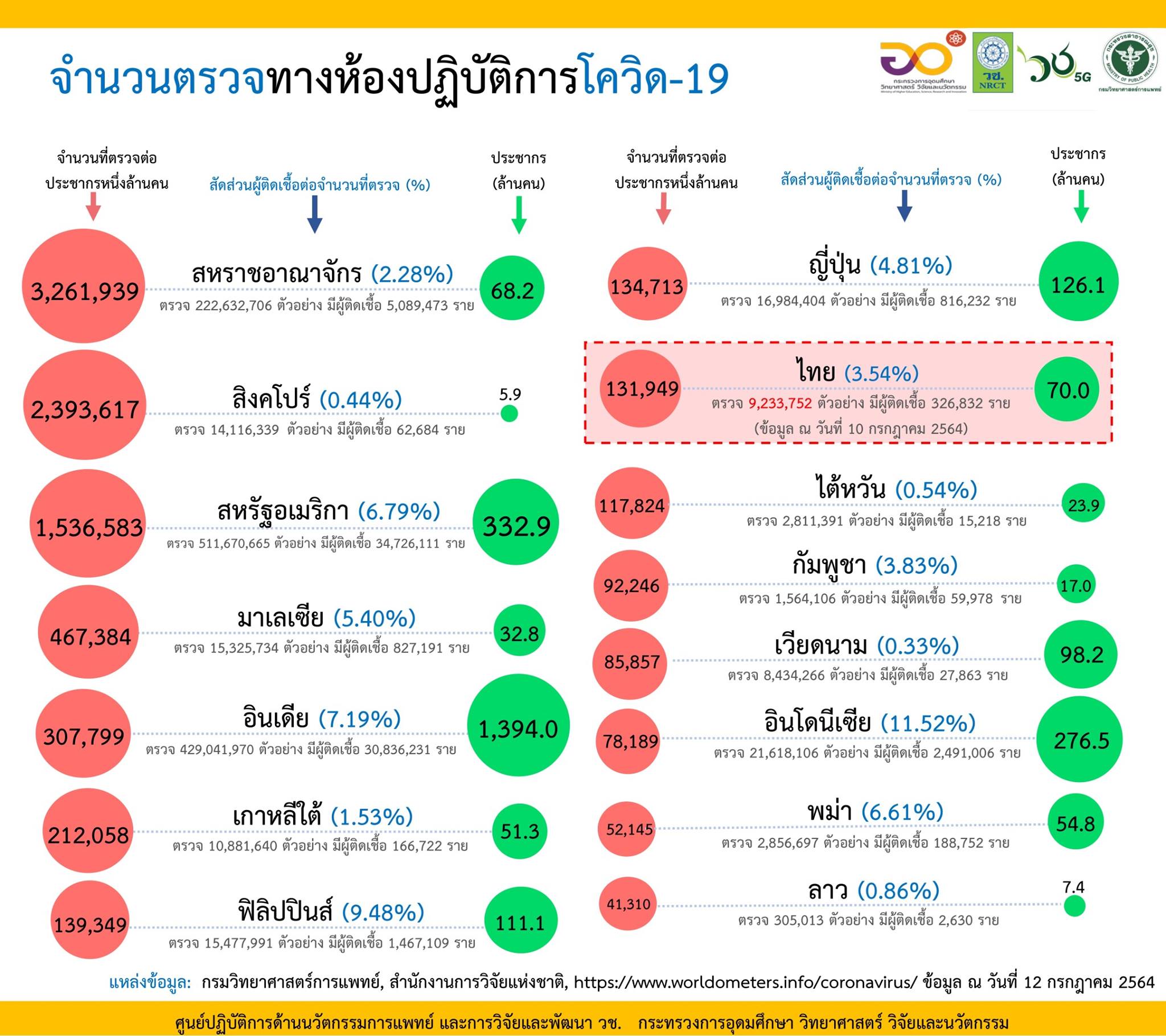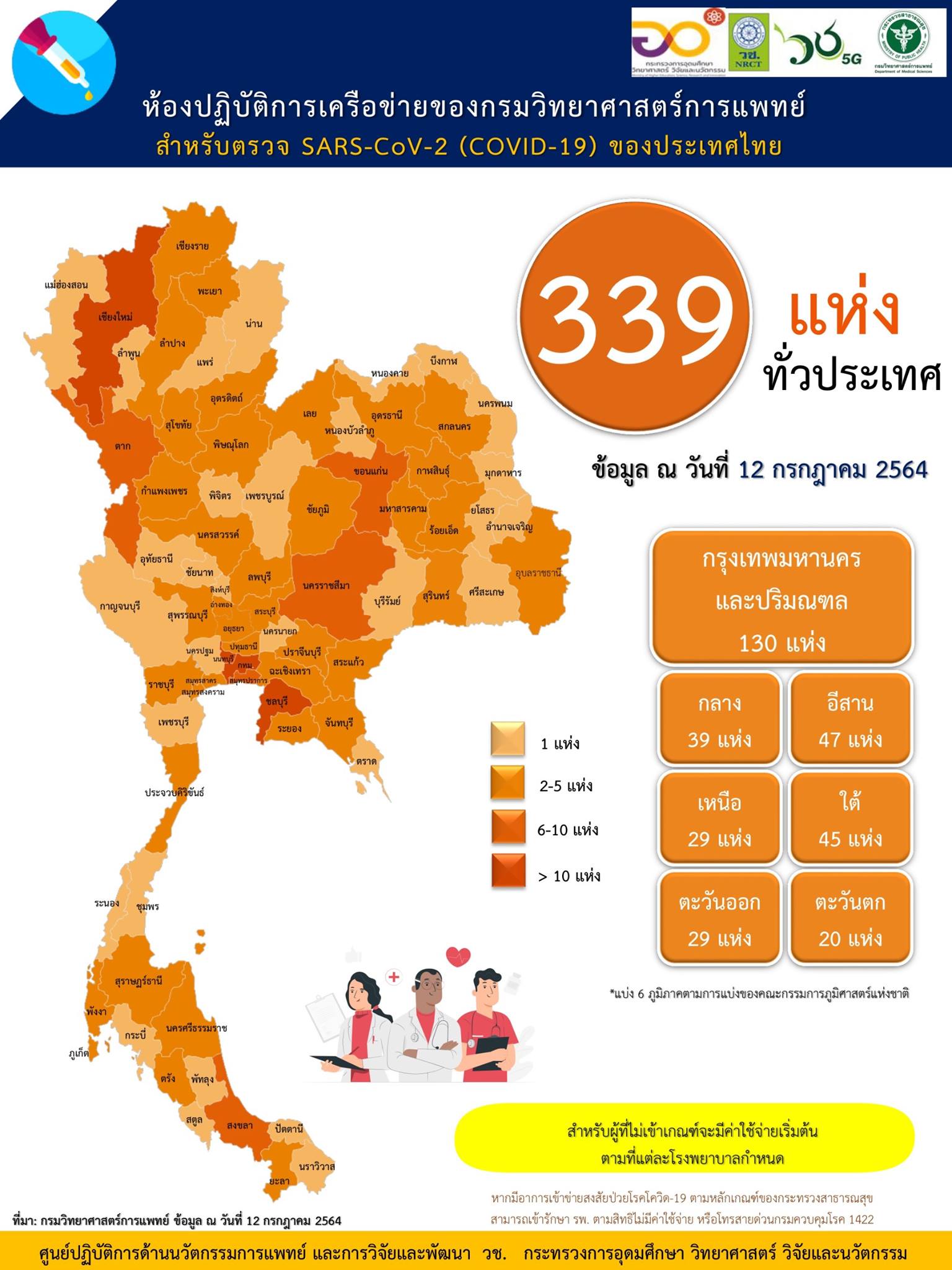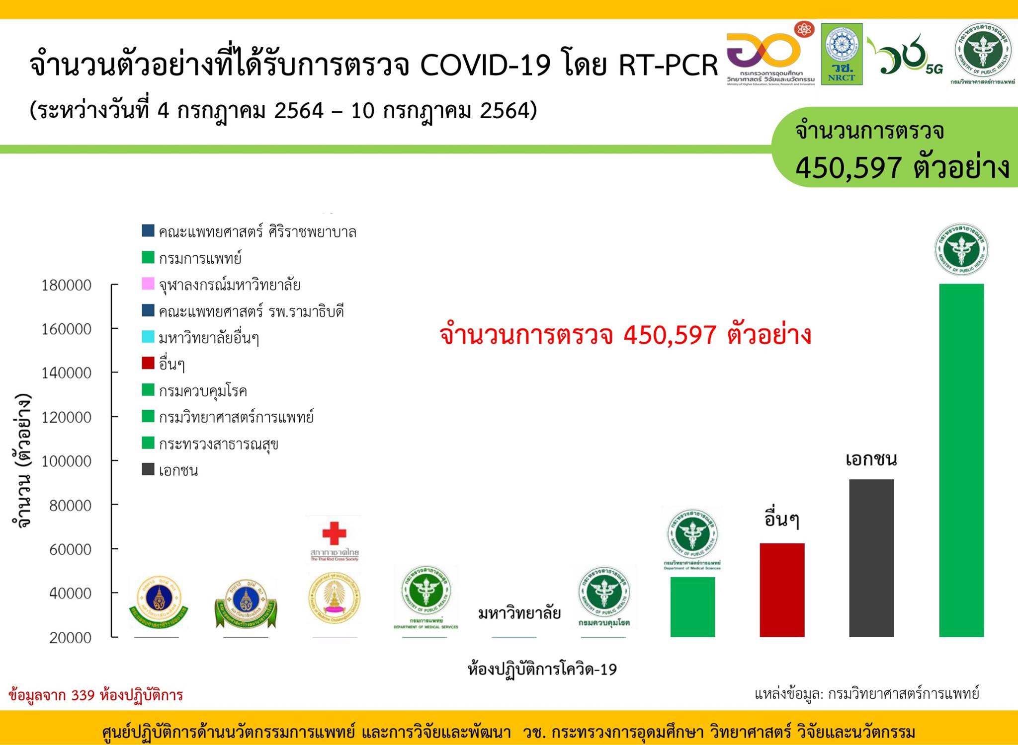 ได้ตรวจไปแล้ว 450,597 ตัวอย่าง โดยห้องปฏิบัติการที่ได้รับการรับรองจากกรมวิทยาศาสตร์การแพทย์มีจำนวน 339 ห้องปฏิบัติการ