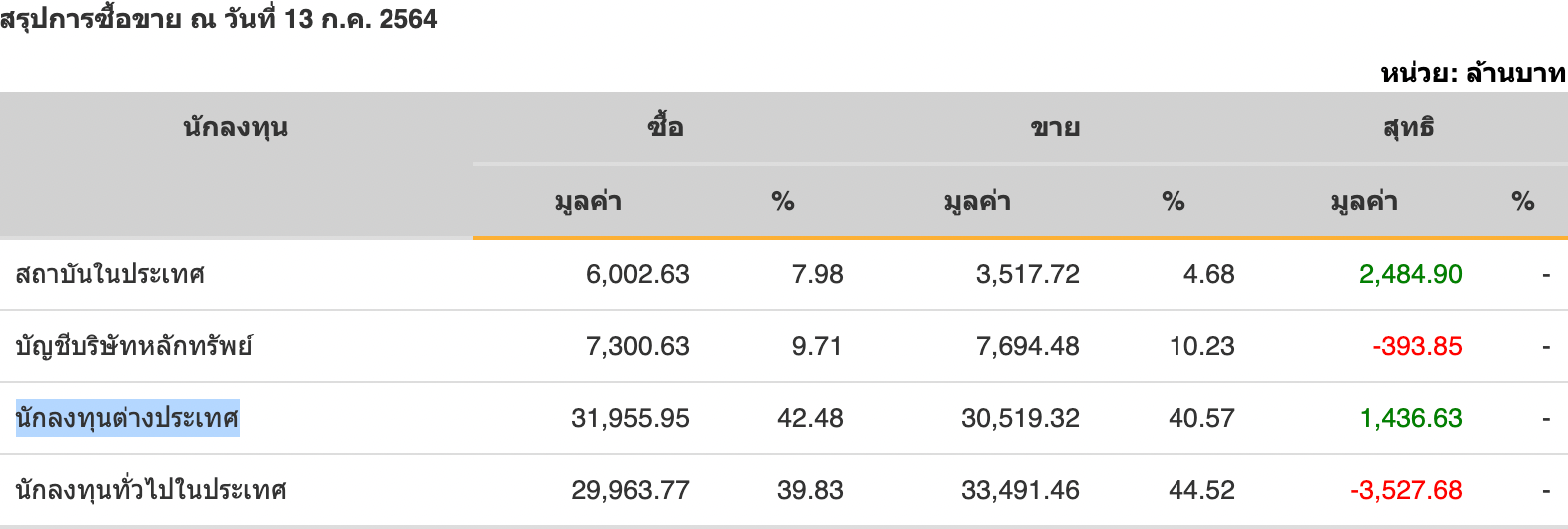 Sinthorn Summary 13/7/2564 : ต่างชาติซื้อสุทธิ 2,185.36 ลบ.