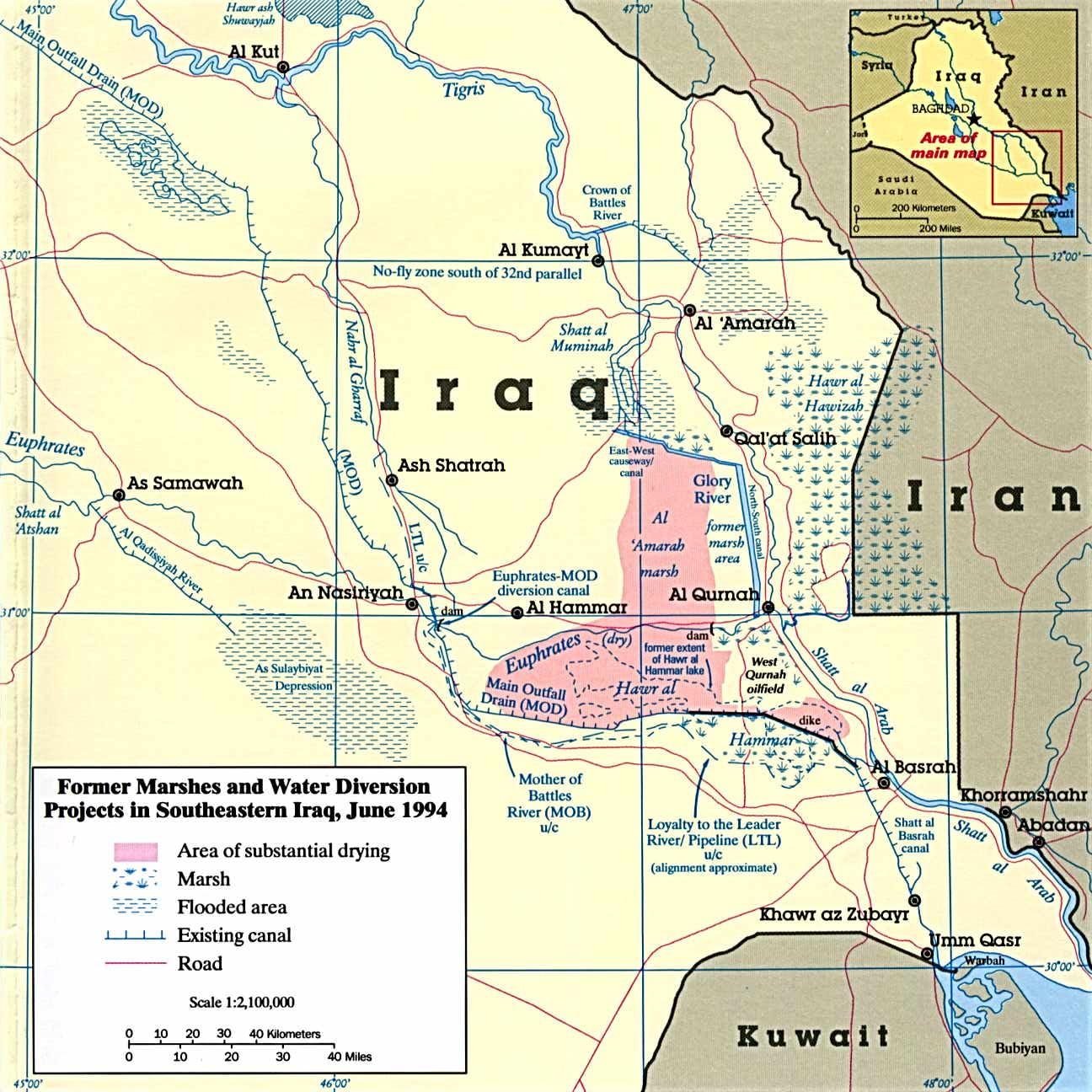 ในตอนนั้นรัฐบาลอิรักใช้วิธีสูบน้ำออกจากพื้นที่บึงกลาง โดยอ้างว่าจะนำไปทำเกษตรกรรมและต้องการลดจำนวนยุง โดยพวกเขาสร้างเขื่อนกั้นแม่น้ำไทกริส แล้วระบายน้ำไปยังคลองแห่งเกียรติยศ (Glory Canal) นอกจากนี้ยังขุดคลองใหม่ชื่อ คลองแห่งความเจริญ (Prosperity Canal) เพื่อกันไม่ให้น้ำไปถึงพื้นที่บึงกลางได้
