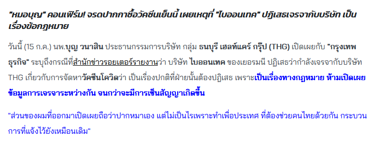 เพจ thailand fact today "We are not in negotiations with the company," "เราไม่ได้เจรจากับบริษัทนี้นะ" เป็นคำตอบที่ทาง Biontech ให้กับ RT เมื่อถูกถามเรื่องกลุ่มธุรกิจธนบุรี อ้าง