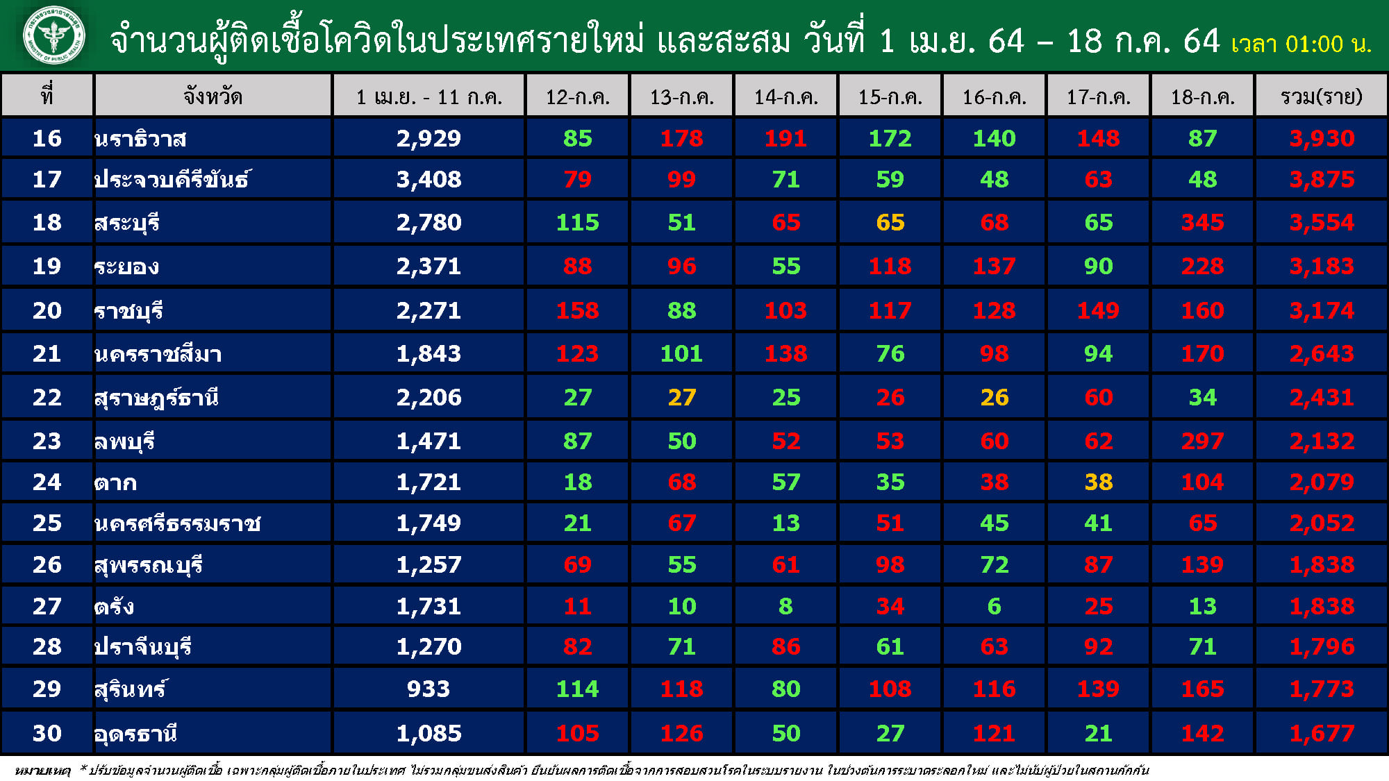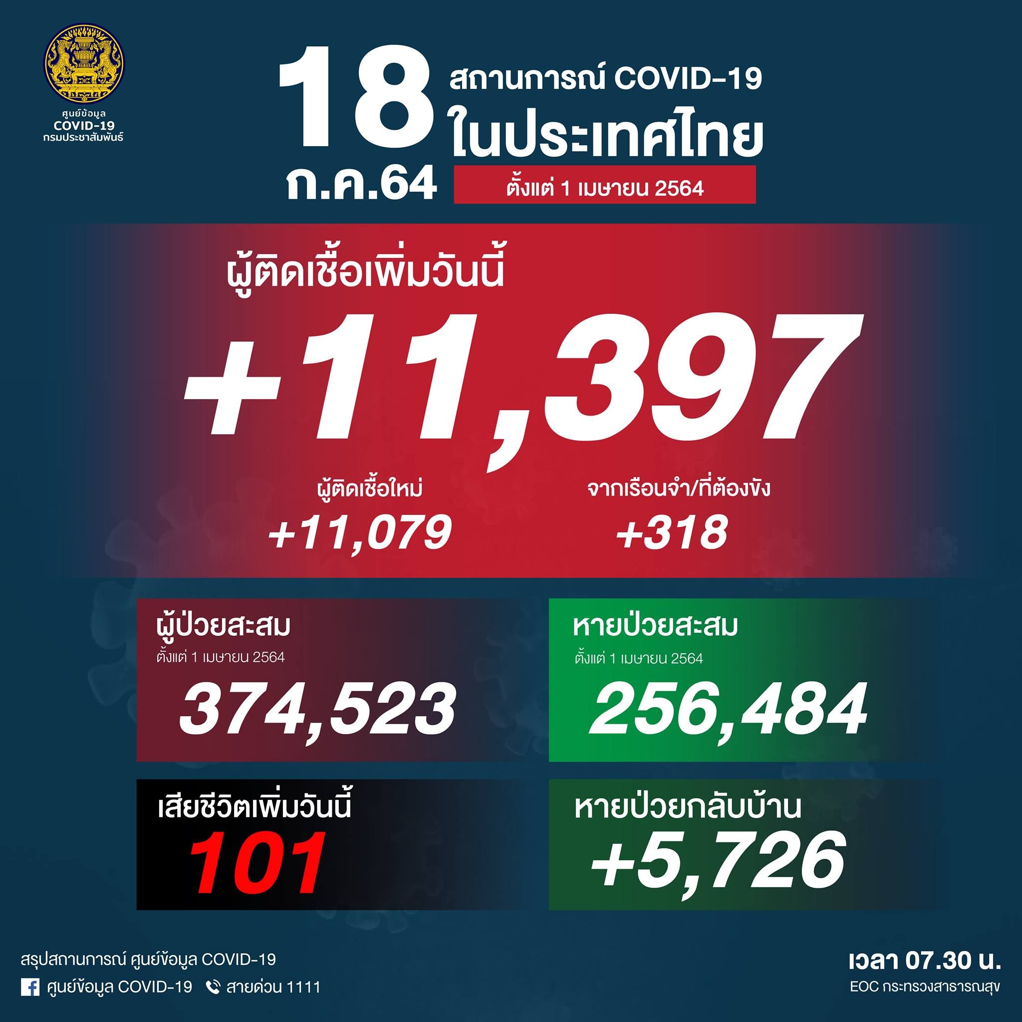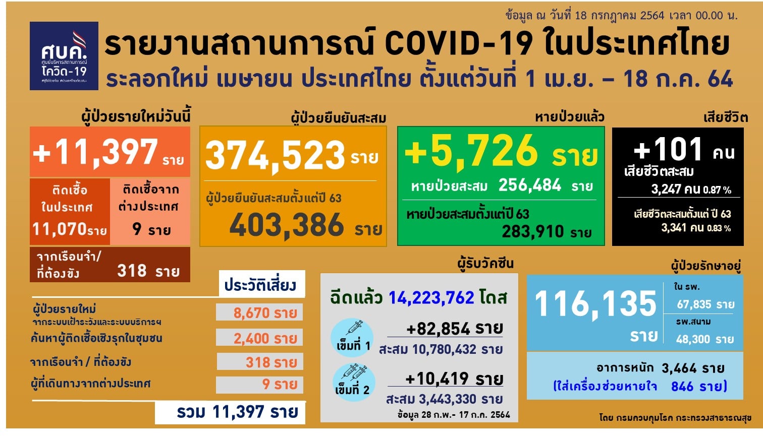 🇹🇭มาลาริน🔴วันนี้(18ก.ค.)ป่วยใหม่11,397คน รักษาหาย5,726คน เสียชีวิต101คน/เปิดมาตรการยกระดับเข้ม