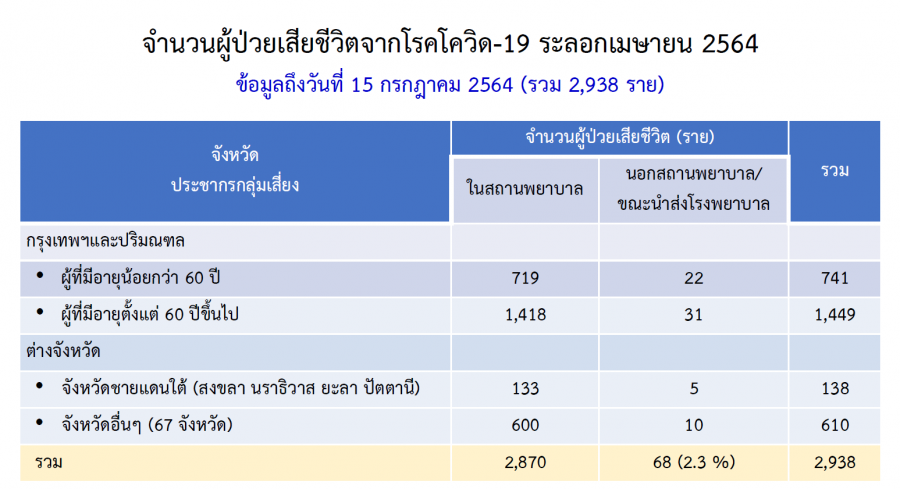 โดยวันนี้มีผู้เสียชีวิตเพิ่มอีก 101 ราย ทำให้การระบาดระลอกใหม่ตั้งแต่เดือน เม.ย. 2564 มียอดผู้เสียชีวิตสะสมสูงถึง 3,247 รายแล้ว ขณะที่ภาพรวมของการเสียชีวิตจากสถานการณ์โควิด-19 มีผู้เสียชีวิตรวม 3,341 ราย