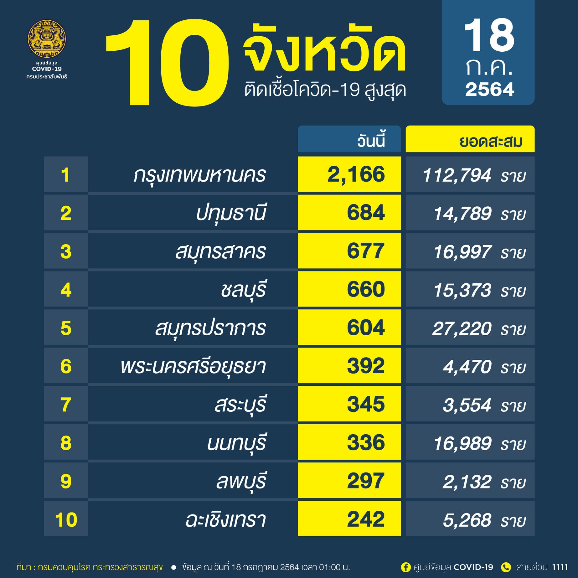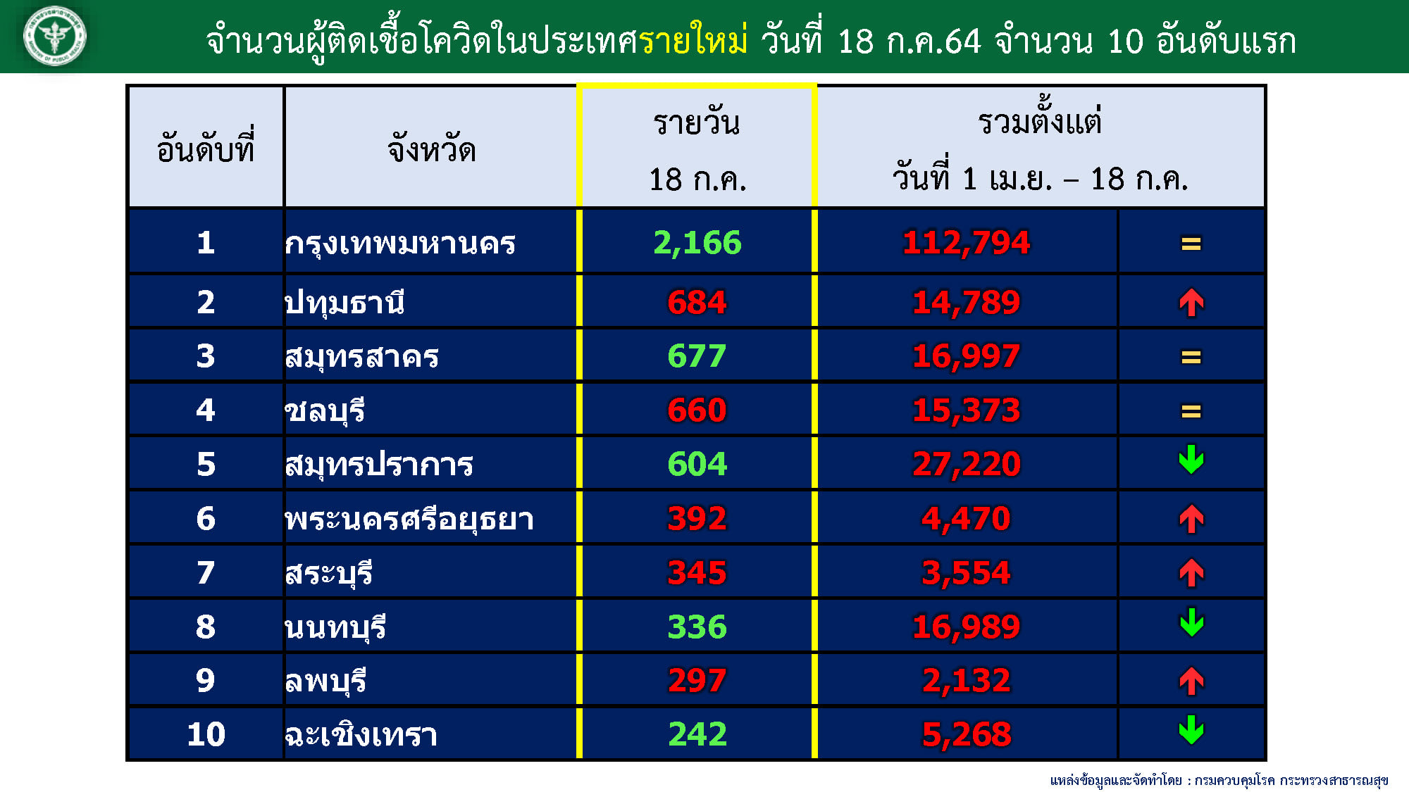 ผู้ติดเชื้อรายใหม่ภายในประเทศ (ไม่รวมเรือนจำ) 11,070 ราย มีรายละเอียดดังนี้จากกรุงเทพฯ(2,166) ปริมณฑล (2,541) จังหวัดอื่น ๆ (6,363)