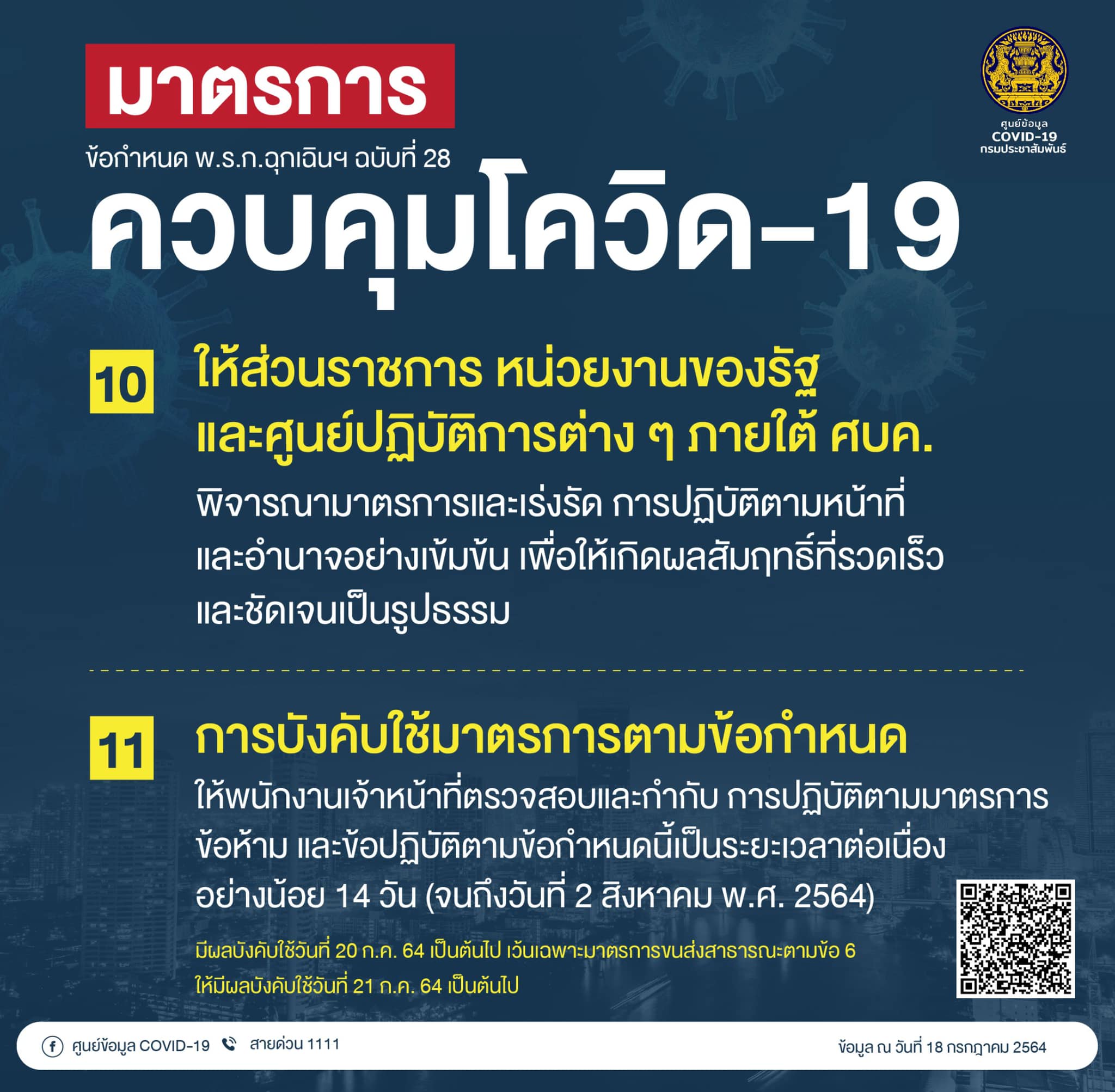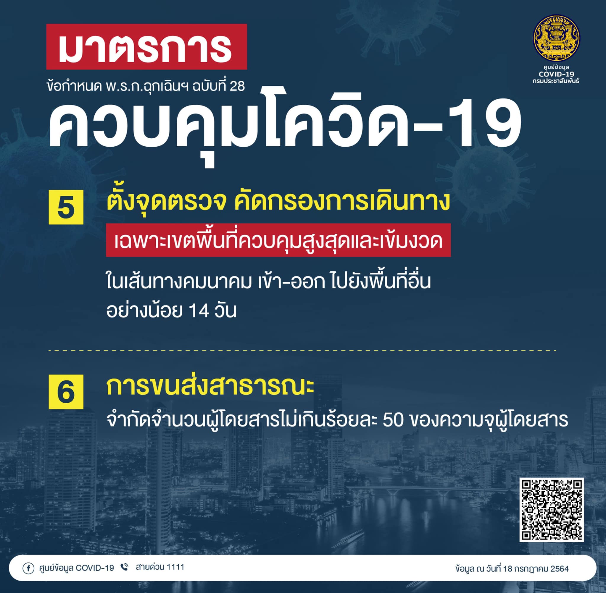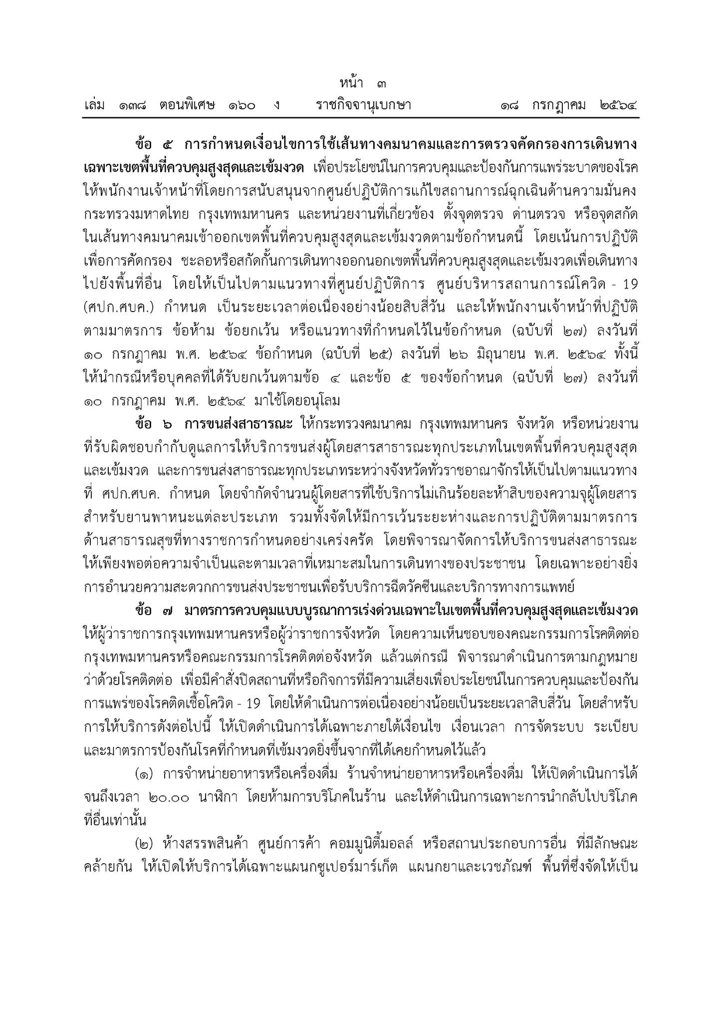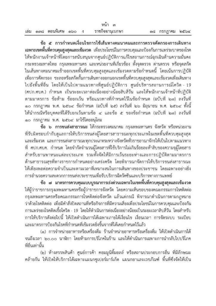 ราชกิจจาบุกเบกษา ได้เผยแพร่ข้อกำหนดออกตามความในมาตรา 9 แห่งพระราชกำหนดการบริหารราชการในสถานการณ์ฉุกเฉิน พ.ศ.2548 (ฉบับที่ 28) เพื่อกำหนดมาตรการที่จำเป็นและเร่งด่วน เพื่อลดการแพร่ระบาดของโรคโควิด-19 ในพื้นที่กรุงเทพมหานครและจังหวัดปริมณฑล และจังหวัดที่ได้กำหนดเป็นเขตพื้นที่ควบคุมสูงสุดและเข้มงวด โดยให้มีผลบังคับใช้วันที่ 20 ก.ค. 64 เป็นต้นไป เว้นเฉพาะมาตรการขนส่งสาธารณะตามข้อ 6 ให้มีผลบังคับใช้วันที่ 21 ก.ค. 64 เป็นต้นไป