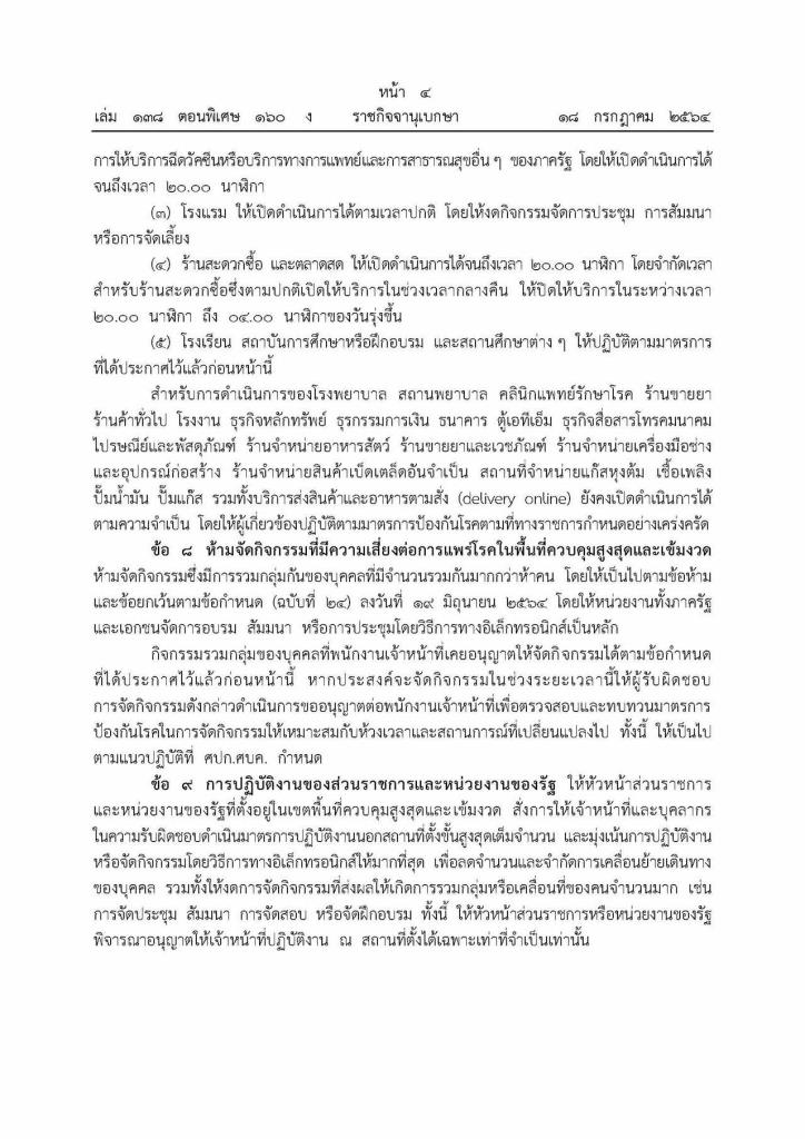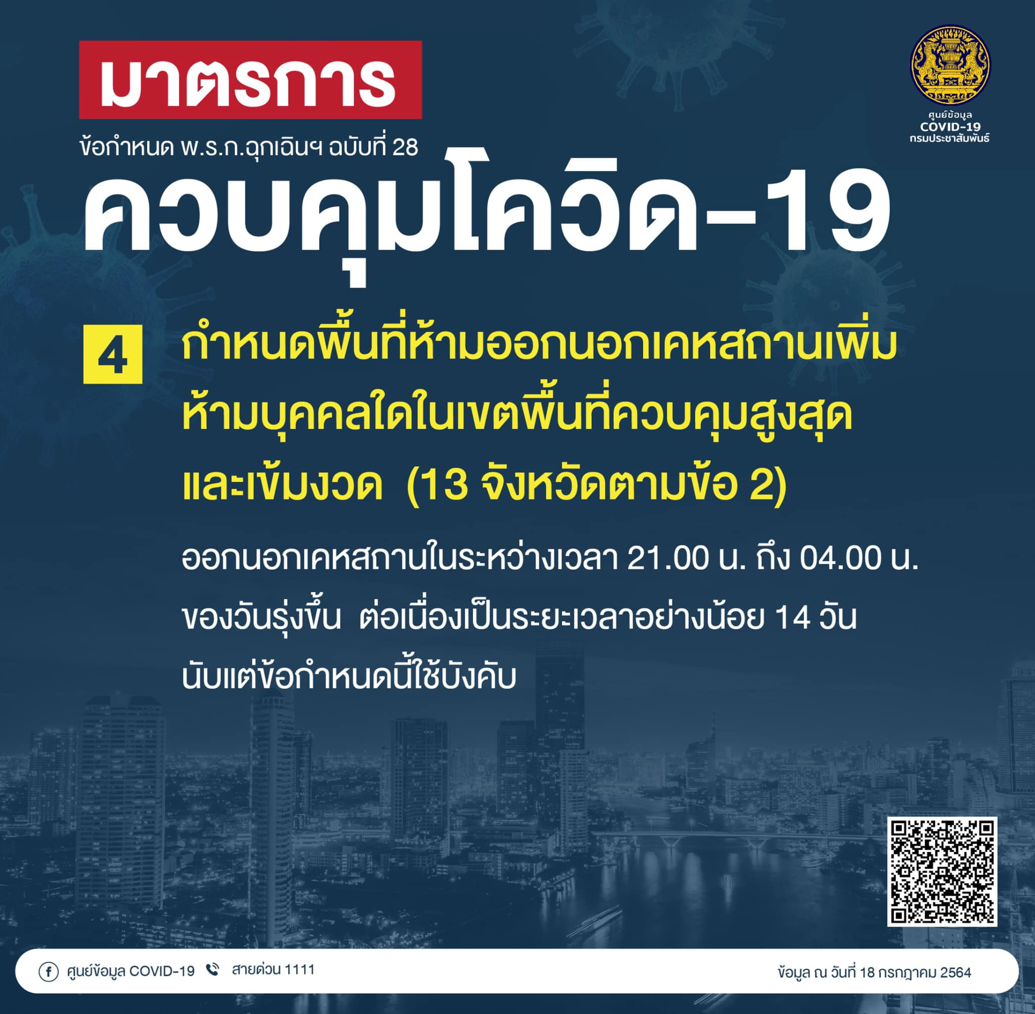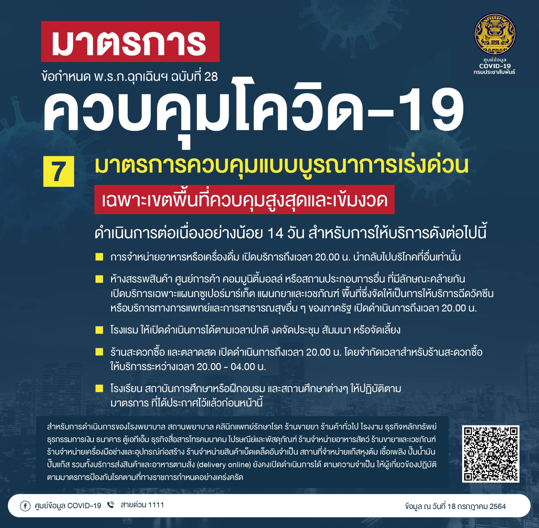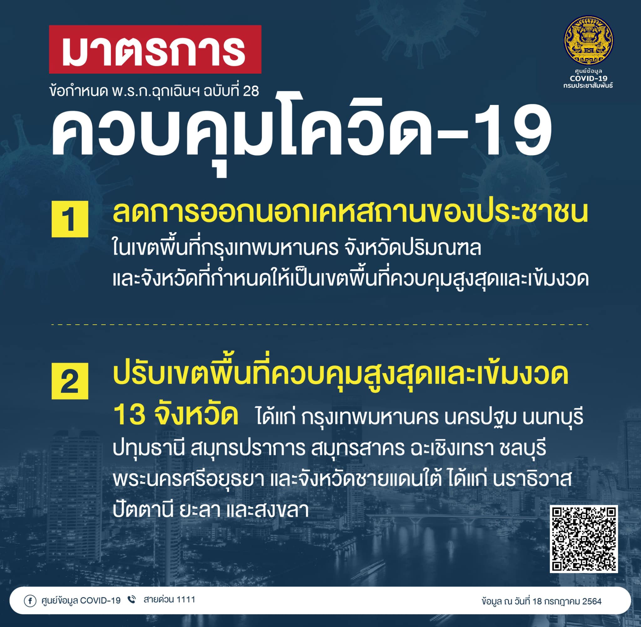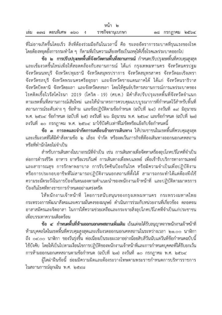 ราชกิจจาบุกเบกษา ได้เผยแพร่ข้อกำหนดออกตามความในมาตรา 9 แห่งพระราชกำหนดการบริหารราชการในสถานการณ์ฉุกเฉิน พ.ศ.2548 (ฉบับที่ 28) เพื่อกำหนดมาตรการที่จำเป็นและเร่งด่วน เพื่อลดการแพร่ระบาดของโรคโควิด-19 ในพื้นที่กรุงเทพมหานครและจังหวัดปริมณฑล และจังหวัดที่ได้กำหนดเป็นเขตพื้นที่ควบคุมสูงสุดและเข้มงวด โดยให้มีผลบังคับใช้วันที่ 20 ก.ค. 64 เป็นต้นไป เว้นเฉพาะมาตรการขนส่งสาธารณะตามข้อ 6 ให้มีผลบังคับใช้วันที่ 21 ก.ค. 64 เป็นต้นไป