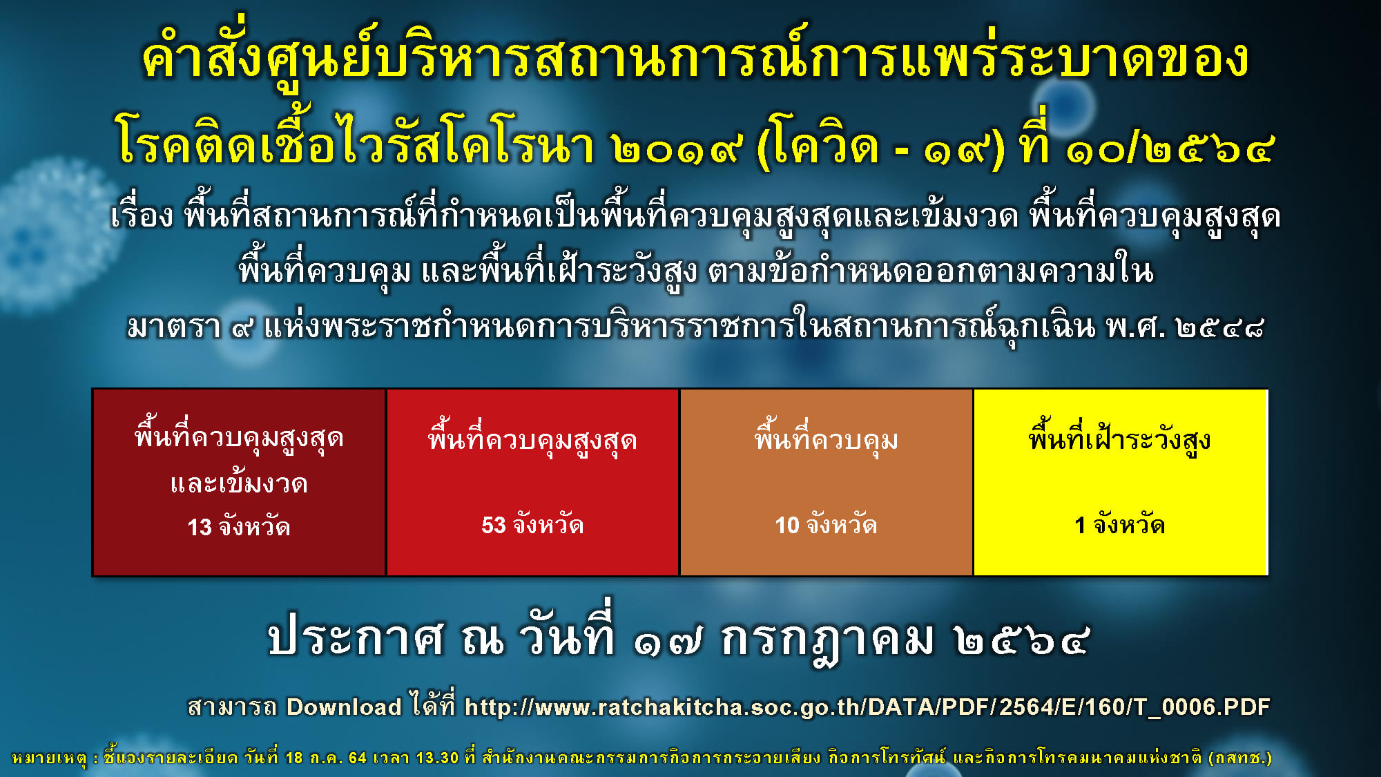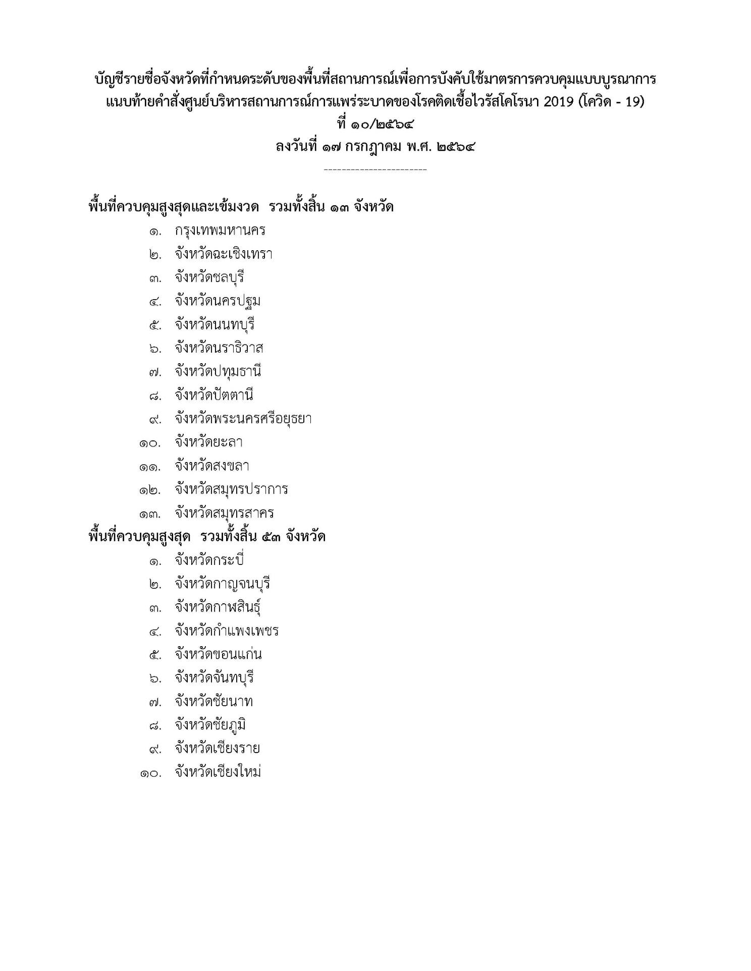 คำสั่งศูนย์บริหารสถานการณ์การแพร่ระบาดของโรคติดเชื้อไวรัสโคโรนา ๒๐๑๙ (โควิด - ๑๙) ที่ ๑๐/๒๕๖๔ เรื่อง พื้นที่สถานการณ์ที่กำหนดเป็นพื้นที่ควบคุมสูงสุดและเข้มงวด พื้นที่ควบคุมสูงสุด พื้นที่ควบคุม และพื้นที่เฝ้าระวังสูง ตามข้อกำหนดออกตามความในมาตรา ๙ แห่งพระราชกำหนดการบริหารราชการในสถานการณ์ฉุกเฉิน พ.ศ. ๒๕๔๘