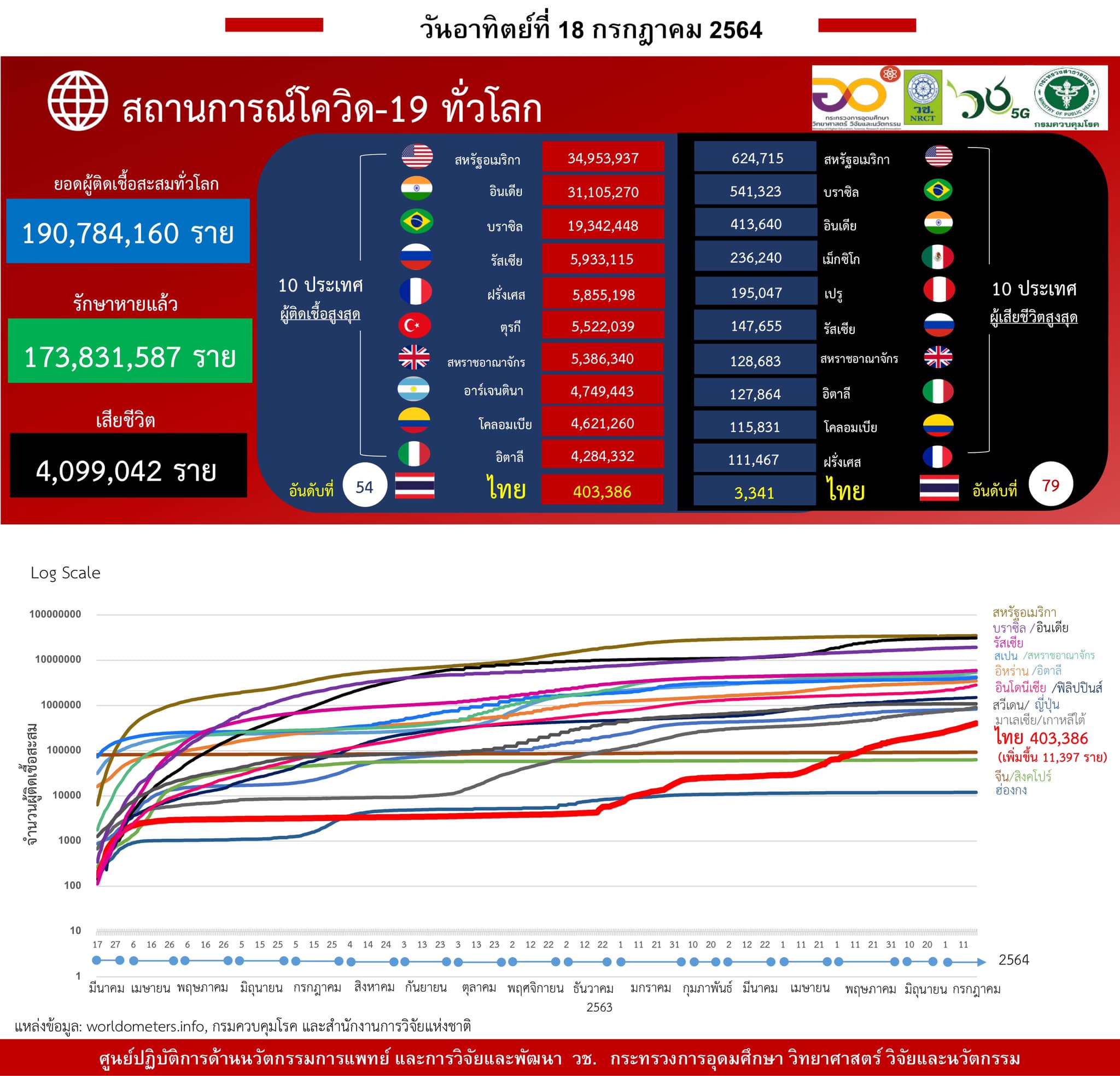 - ยอดผู้ติดเชื้อสะสมทั่วโลก 190.7 ล้านราย มีจำนวนผู้เสียชีวิตสะสมกว่า 4 ล้านราย(คิดเป็นร้อยละ 2.15 ของจำนวนผู้ติดเชื้อ) ในขณะที่ผู้รักษาหายมีจำนวน 173.8 ล้านราย (คิดเป็นร้อยละ 91.11)