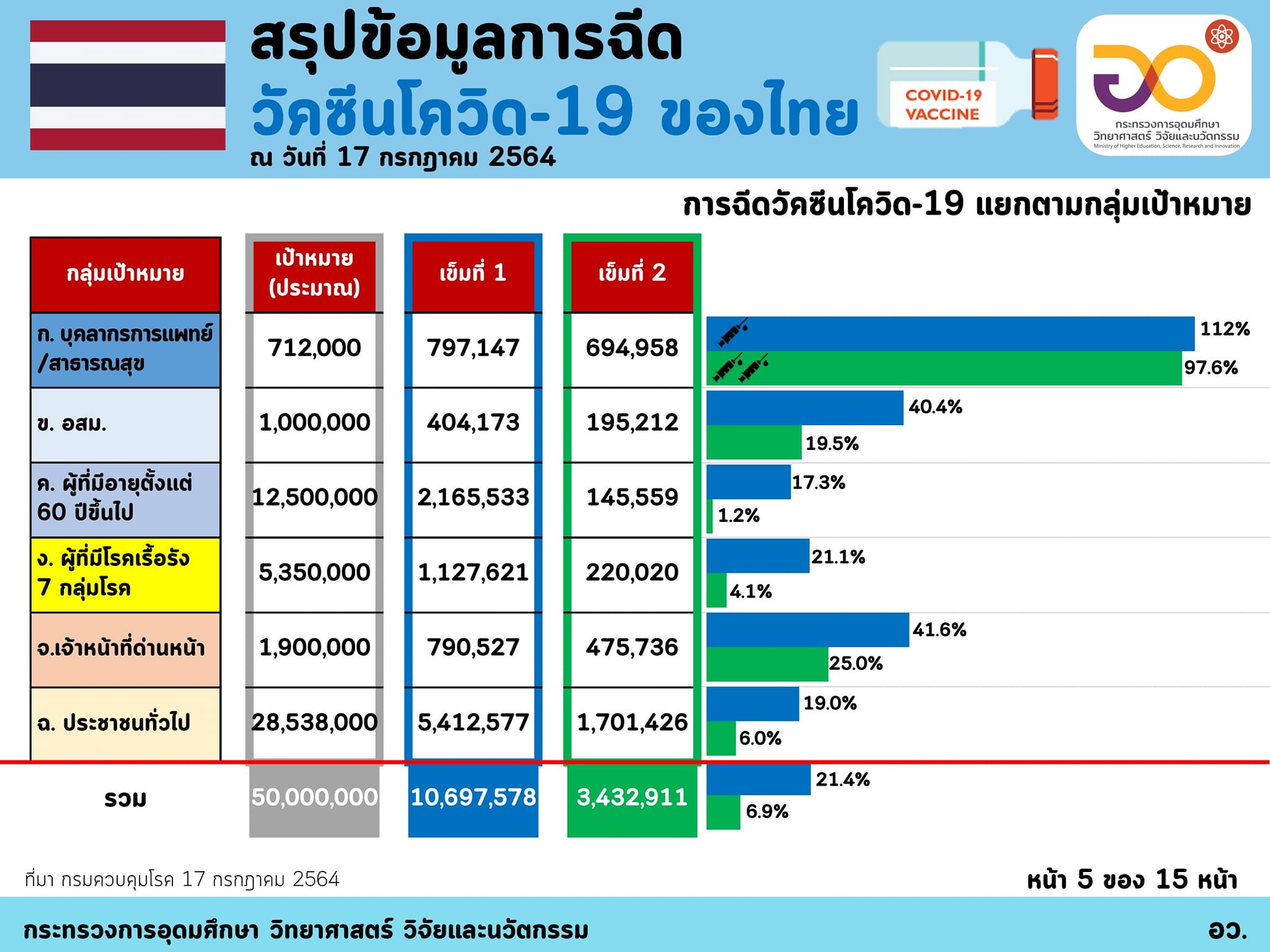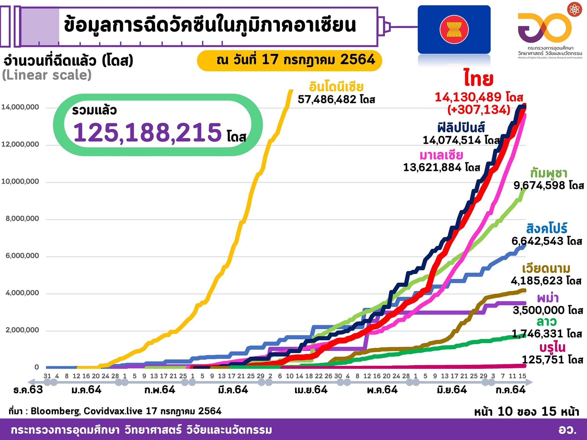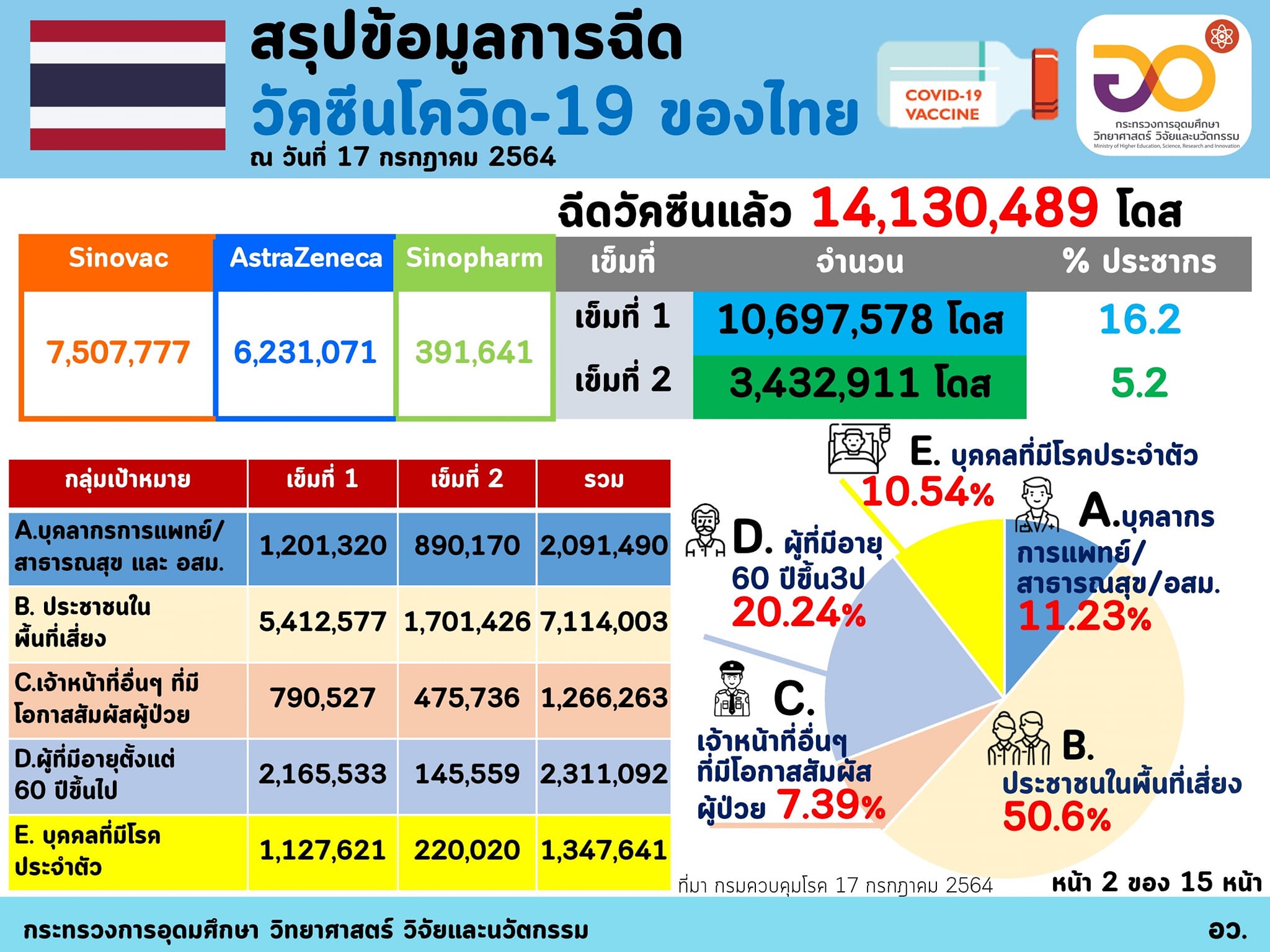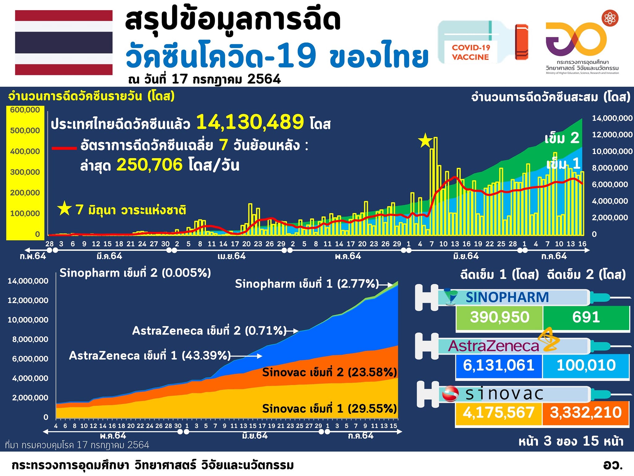 (17 กรกฏาคม 2564) ศาสตราจารย์ ดร. นายแพทย์สิริฤกษ์ ทรงศิวิไล ปลัดกระทรวงการอุดมศึกษา วิทยาศาสตร์ วิจัยและนวัตกรรม (อว.) รายงานว่า ในขณะนี้ประเทศไทยได้ฉีดวัคซีนโควิด-19 แล้ว จำนวนรวม 14,130,489 โดส ซึ่งเป็นลำดับที่สองในภูมิภาคอาเซียนในแง่จำนวนการฉีด โดยมีผู้ที่ได้รับวัคซีนแล้วอย่างน้อยหนึ่งเข็ม จำนวน 10,697,578 คน หรือเท่ากับ 16.2% ของประชากร คิดเป็นอันดับ 5 ของอาเซียนในแง่สัดส่วนประชากรที่ได้รับวัคซีน และได้ฉีดครบสองเข็มแล้ว 3,432,911 คน หรือเท่ากับ 5.2% ของประชากร